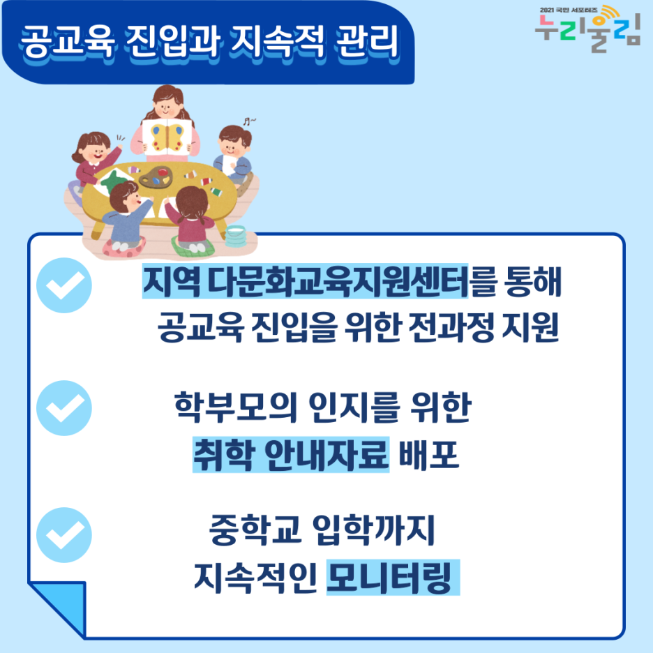 첫 번째로, 교육부에서는 안정적인 공교육 진입 기반 마련을 통해 다문화 학생들의 재학률을 증가시키고자 노력하고 있습니다. 그 예시로 지역 다문화교육지원센터를 통해 입학·편입학, 정책학교, 학적 생성 등 공교육 진입을 위한 전 과정을 지원합니다. 다문화 학생의 교육을 보장하기 위해서는 학부모의 교육 인지가 필수적인데요. 교육부는 법무부와 연계하여 다문화 가정 학부모들에게 13개 국어로 된 학교 편입학 안내 자료와 클립형 영상을 제공하고 있습니다. 또한, 다문화 가정의 방문이 잦은 기관에 공교육 진입 안내 자료를 배포하였으며 초등학교 입학 예정 대상인 만 6세 자녀 학부모에게는 추가적인 입학 안내(12월, 2월)를 하고 있습니다. 적합한 시기에 입학할 수 있도록 알림과 동시에 학업 중단을 막고자 교육부는 지속적인 모니터링도 함께 하고 있는데요. 「초·중등교육법 시행령」 개정으로 교육장이 정하는 방식으로 중학교를 배정할 수 있게 하면서 다문화 학생의 중학교 입학 거부 사례를 막고 있습니다.