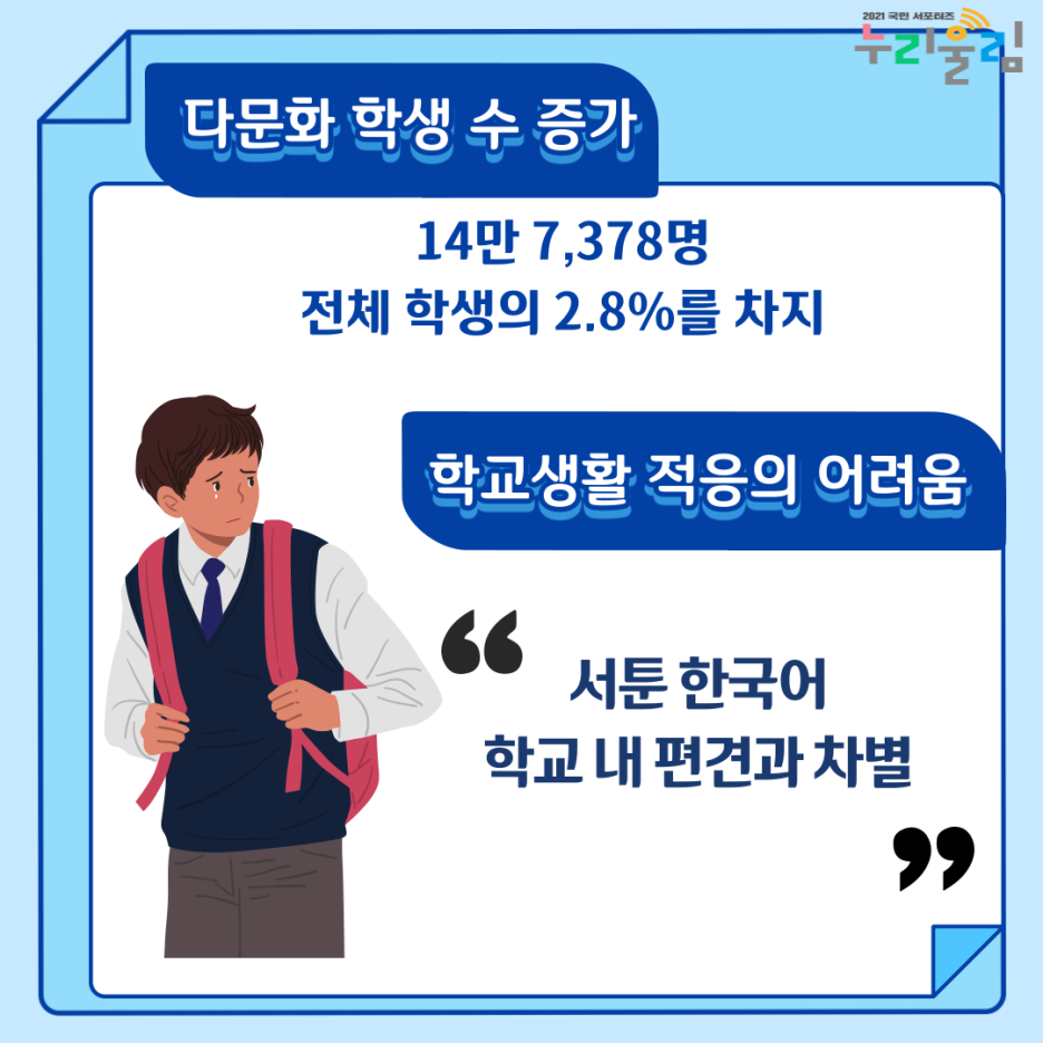 세계화가 되면서 국내에 거주하고 있는 외국인이 한국인과 결혼하여 가정을 꾸리는 모습을 흔히 볼 수 있게 되었는데요. 다문화 가정이 증가하면서 학교 속에서 다문화 학생들이 점차 늘어나고 있습니다. 「다문화가족지원법」 제2조 제1호에 따르면 국제결혼을 한 부모의 자녀뿐 아니라 탈북하여 한국인으로 생활하는 청소년 모두 다문화 가정의 청소년이라고 할 수 있는데요. 2020년 4월 교육부 통계에 따르면 다문화 학생 수는 계속 증가해 14만 7,378명으로 전체 학생의 2.8%를 차지하고 있습니다. 2012년과 비교하면 약 3배 수준으로 증가한 상황이지만 여전히 다문화 학생들은 학교 적응에 어려움을 겪고 있었는데요. 한국 청소년 상담복지 개발원의 조사 결과에 따르면 부모가 한국어에 서툰 다문화 가정 학생의 경우 언어 습득에 어려움을 보일 뿐 아니라 단지 부모가 외국인이라는 이유로 집단 따돌림을 당하는 경우도 있다고 합니다. 이렇게 학교 내에서 존재하는 편견과 차별은 다문화 청소년들에게 큰 상처를 주며 학교생활 적응을 어렵게 만들고 있었습니다.