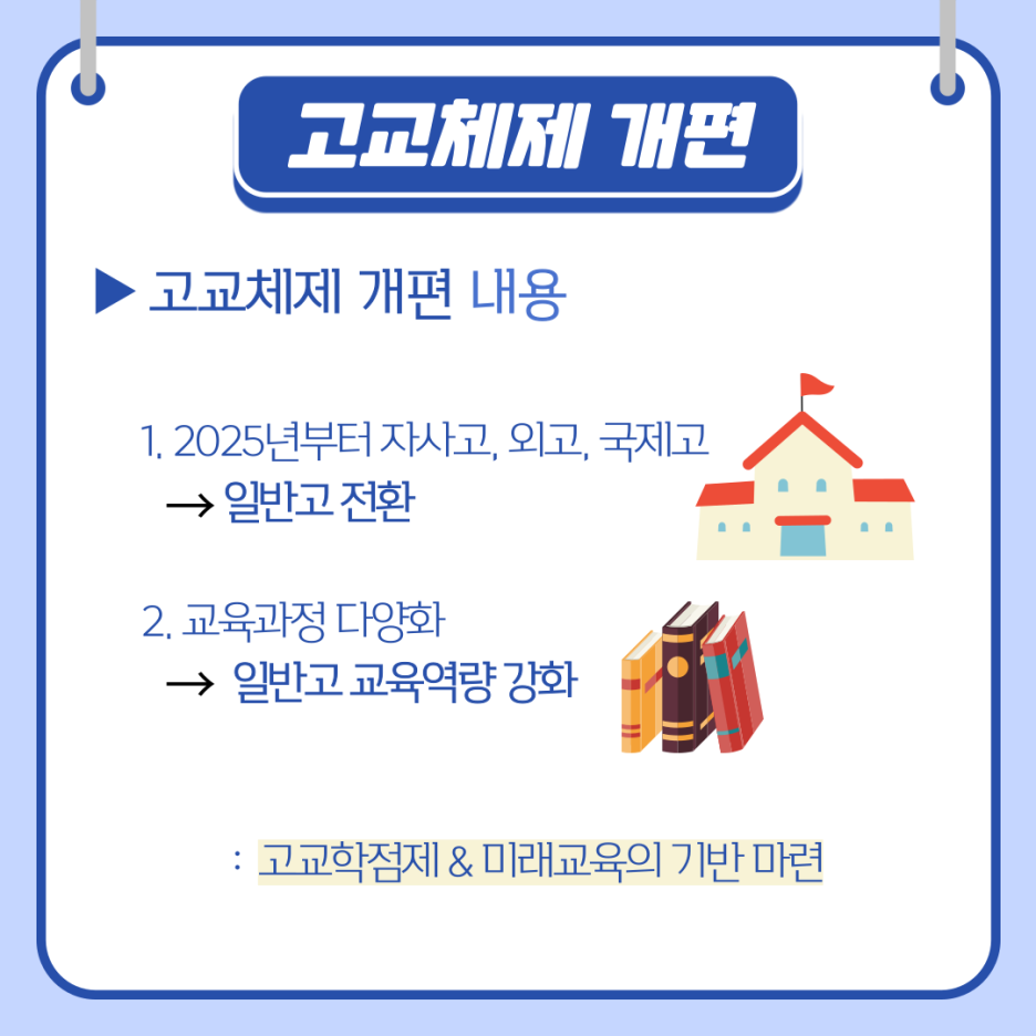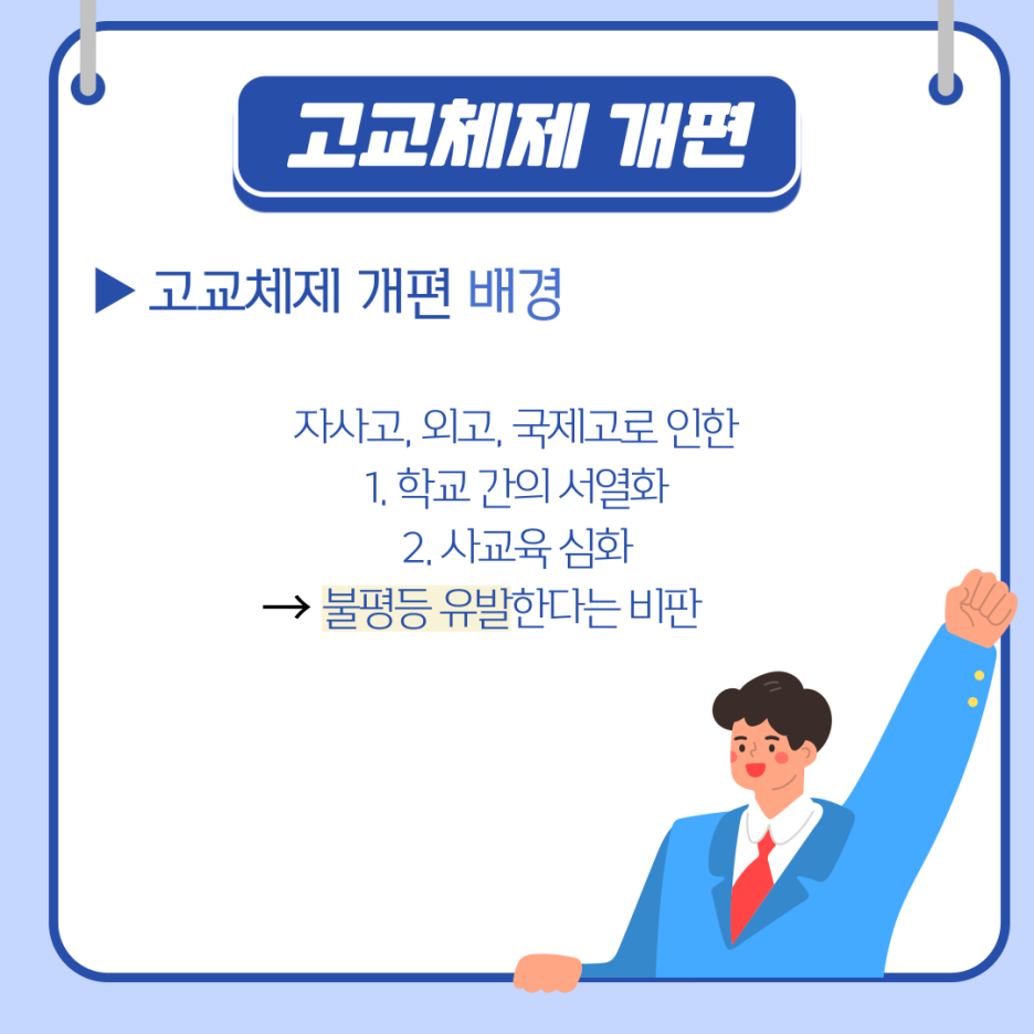 그동안 자사고, 외고, 국제고는 고교체제는 설립 취지와 다르게 학교 간의 서열화를 만들고, 사교육을 심화시키는 등 불평등을 유발한다는 비판을 받았는데요. 실제로 2018년 사교육비는 일반고 진학 희망자 대비 외고와 국제고는 1.7배였고, 자율고는 일반고의 1.4배인 것으로 나타났습니다. 이에 따라 교육부는 우수학생 선점 및 고입 경쟁을 완화하기 위해 고교체제를 개편했답니다. 교육부는 2025년부터 자사고, 외고, 국제고를 모두 일반고로 일관 전환하고, 교육과정을 다양화함으로써 일반고의 교육역량을 강화하는 것을 목표로 했는데요. 이를 통해 고교학점제와 미래 교육의 기반을 마련하고자 했습니다.