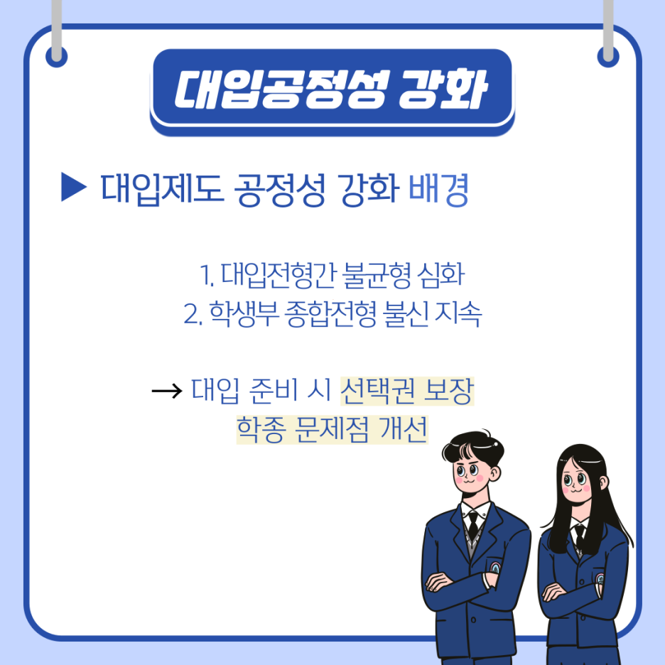 2018년 8월에 발표한 ‘2022학년도 대학입학제도 개편방안’ 등을 통해 교육부는 학생부종합전형의 공정성과 투명성을 높이기 위해 노력했으나 대입전형 간 불균형이 심해지고 학생부 종합전형에 대한 불신은 사라지지 않았습니다. 이에 따라 교육부는 학생들의 대입 준비에 대한 선택권을 보장하고 학종 실태 결과에서 나타난 문제점들을 개선하기 위해 추가적으로 2019년에 「대입제도 공정성 강화 방안」을 마련했습니다.