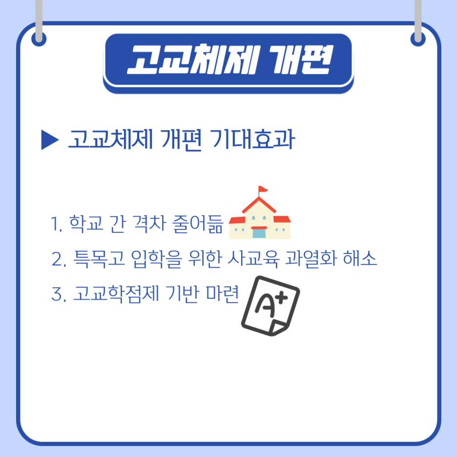 고교체제의 개편으로 2025년부터 자사고, 외고, 특목고가 일반고로 전환된다면 우선 학교별 격차들이 줄어들 수 있어요. 지금까지는 영재고, 과학고, 자사고, 외국어고, 국제고 등으로 고교체제가 구분되었는데요, 일반고 개편으로 다방면에서 다양성을 지닌 학생들과 함께 어우러져 생활하는 공간이 만들어질 수 있어 고등학생들이 더불어 성장할 수 있는 긍정적인 측면을 가져올 수 있을 것 같습니다. 또한, 특목고 입학을 위한 사교육 과열화도 점점 조금씩 해소될 것이라는 긍정적인 반응이 있었어요. 더 나아가 고교 서열화를 없앰으로써 2025년부터 고교학점제의 운영을 위한 기반을 마련할 수 있는 출발점이 될 수 있기에 여러 가지 측면에서 고교체제 개편의 효과를 기대해도 좋을 것 같습니다.
