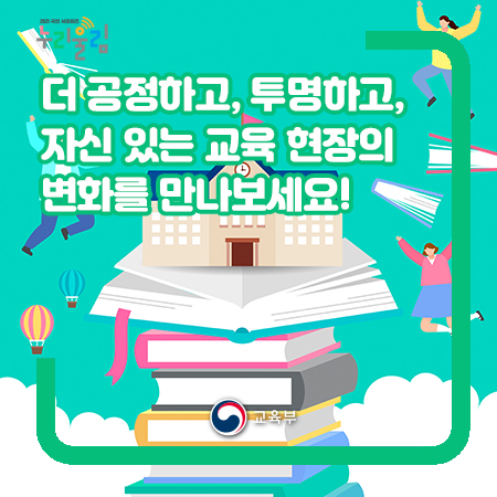 여러분, 어느덧 정부 4주년을 맞이하게 되었습니다! 특히 최근에는 코로나19 상황을 맞이하며 새로운 대응책들이 필요해졌어요. 이에 교육부도 혼란스러운 코로나19 상황 속에서 학교의 일상 회복부터 미래사회의 대응 등의 다양한 노력들을 했는데요, 그중에서도 교육의 투명성과 공정성을 강화하기 위해서 많은 노력을 했습니다.