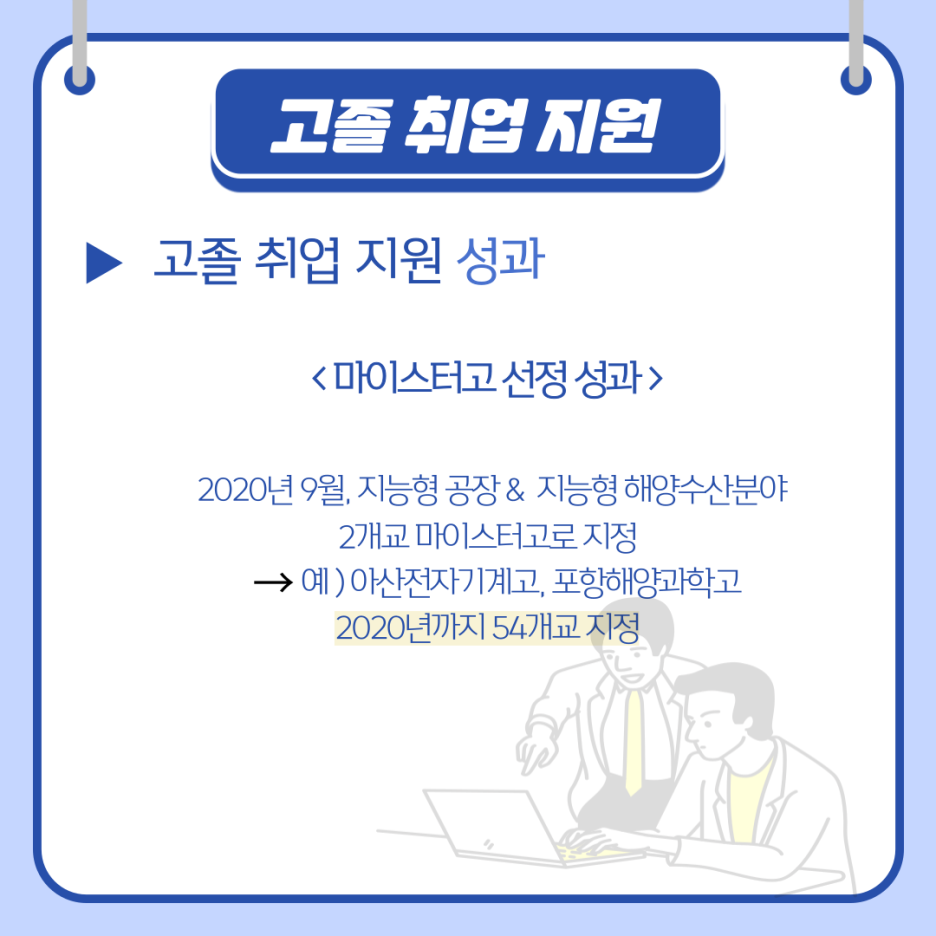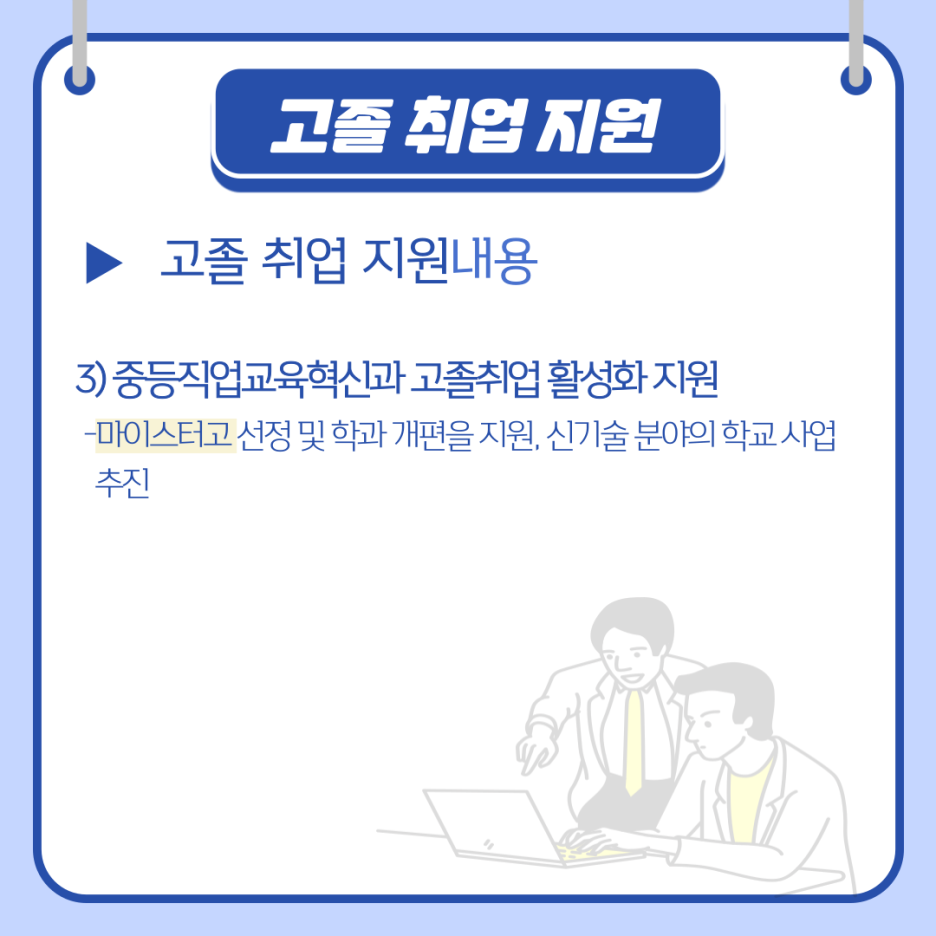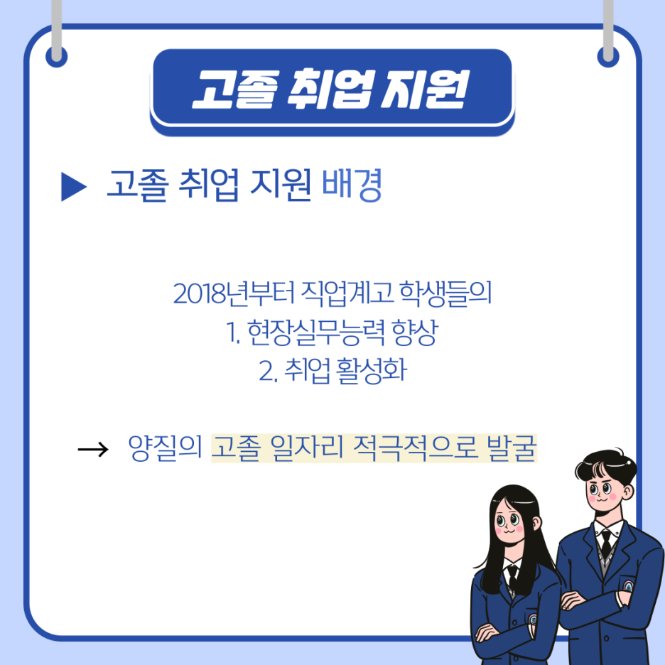 이처럼 교육부는 대입전형을 더욱더 투명하고 공정하게 개선하기 위해 노력했는데요! 더 나아가 교육부는 고졸 학생들의 취업 지원을 위한 노력도 아끼지 않았습니다. 한번 자세히 알아보도록 할까요?