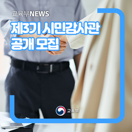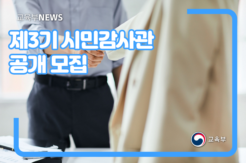 교육부는 제3기 시민감사관을 5월 25일(화)부터 6월 7일(월)까지 교육부 누리집(www.moe.go.kr)을 통해 공개 모집한다.