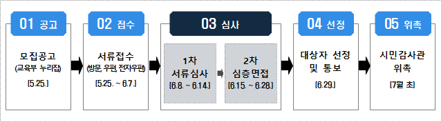 신청서 접수 후 교육부 내외부 인사 6명으로 구성된 공모 심사위원회에서 서류심사(1차)와 심층면접(2차)을 거쳐 적격자를 선정하고, 7월 초에 위촉할 예정이다.