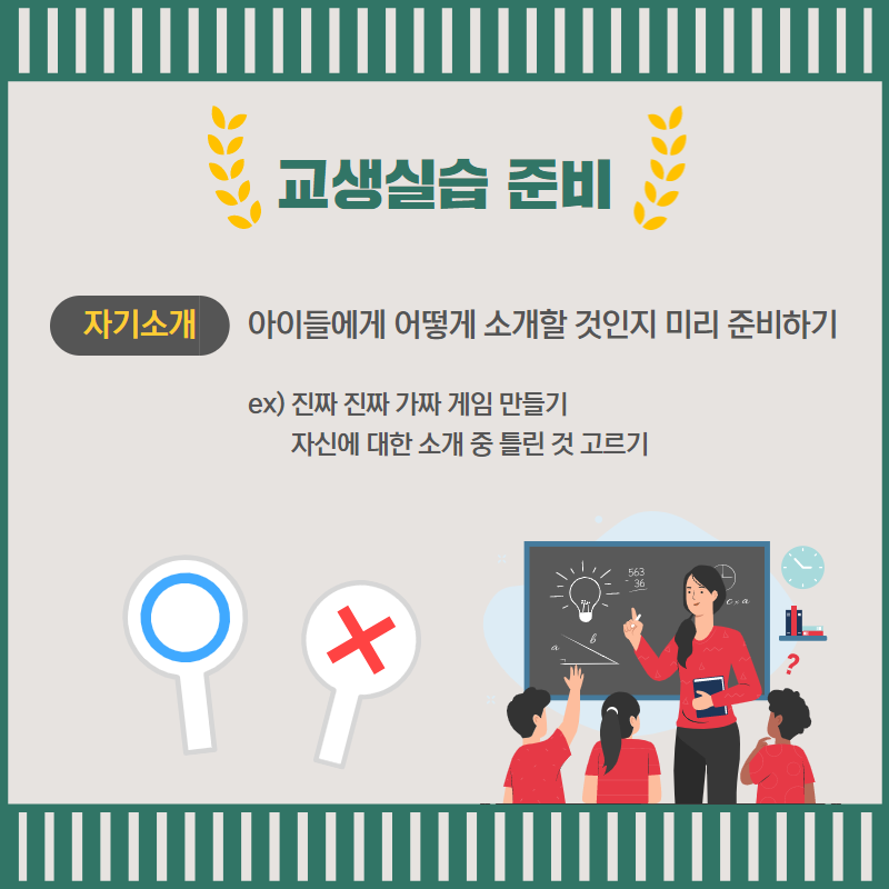 교생은 아이들에게는 새로운 사람들이고, 교생 선생님도 아이들과 잘 지내길 원하기 때문에 특히 기간이 길지 않은 교생 실습이라면 학생들과의 벽을 최대한 빨리 허물고 다가가는 것이 좋습니다. 저는 ‘진짜 진짜 가짜 게임’을 준비했는데요. 자신에 대한 소개 중 틀린 것을 고르는 게임인데 아이들과 게임으로 쉽게 친해지고 소개하는 기회도 가질 수 있어서 좋았답니다.