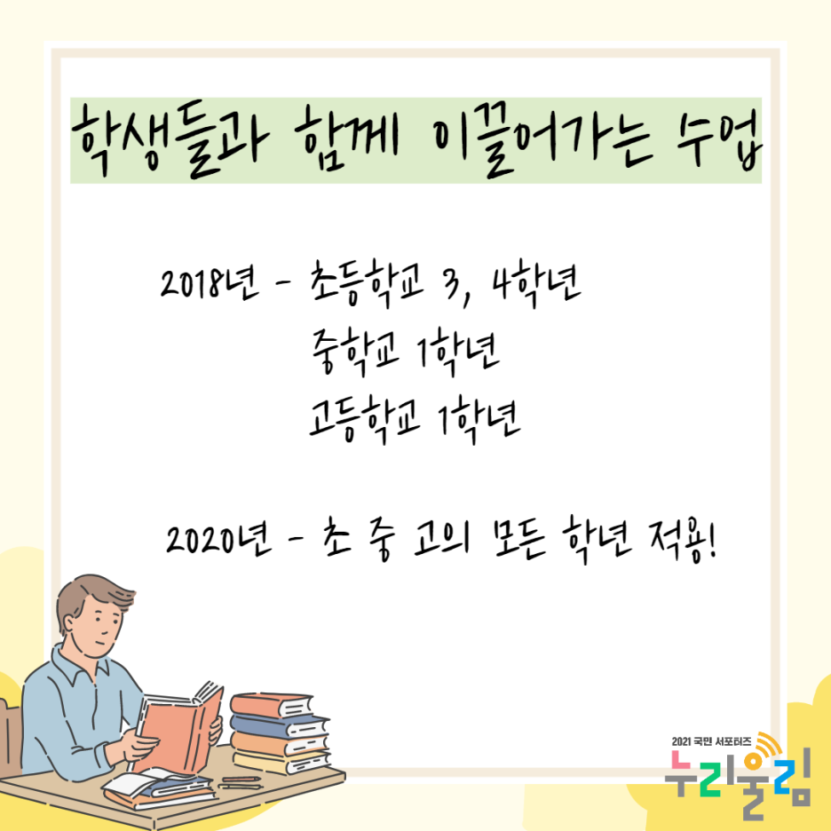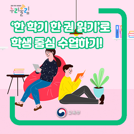 ‘한 학기 한 권 읽기’라는 수업은 2018년부터 초등학교 3, 4학년, 중학교 1학년, 고등학교 1학년에서 시작되었으며 2020년부터는 초·중·고의 모든 학년에 적용되었습니다. 수업의 이름답게, 학생들은 한 학기에 책 한 권을 골라서 수업 시간 내에 책을 온전히 읽습니다. 학생들은 책을 읽는 것을 통해 책 읽는 즐거움을 아는 것은 물론이고, 비판적이고 창의적인 사고능력을 기를 수 있으며 심지어 꿈을 가지게 될 수도 있습니다. 또한, 작품을 무작정 외우는 것이 아니라, 학생들이 자발적으로 수업에 참여하고 작품에 대한 자신의 생각을 자유롭게 이야기해볼 수 있는 시간을 가지게 됩니다. 학생들과 함께 이끌어가는 수업이 비로소 만들어질 수 있는 것입니다.