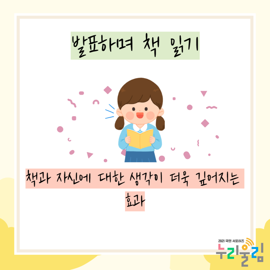 두 번째 방법은 ‘발표’의 방법입니다. 학생들은 ‘책을 고른 이유’, ‘책을 읽으며 느꼈던 감정’. ‘책의 소개’ 등 여러 가지를 발표할 수 있습니다. 다른 책을 고른 학생들은 발표자가 고른 책에 호기심을 느끼고 그 책을 자발적으로 찾아볼 수도 있으며, 발표자는 발표를 준비하며 책과 자신에 대한 생각을 더욱 깊이 할 수 있다는 장점을 가지고 있습니다.