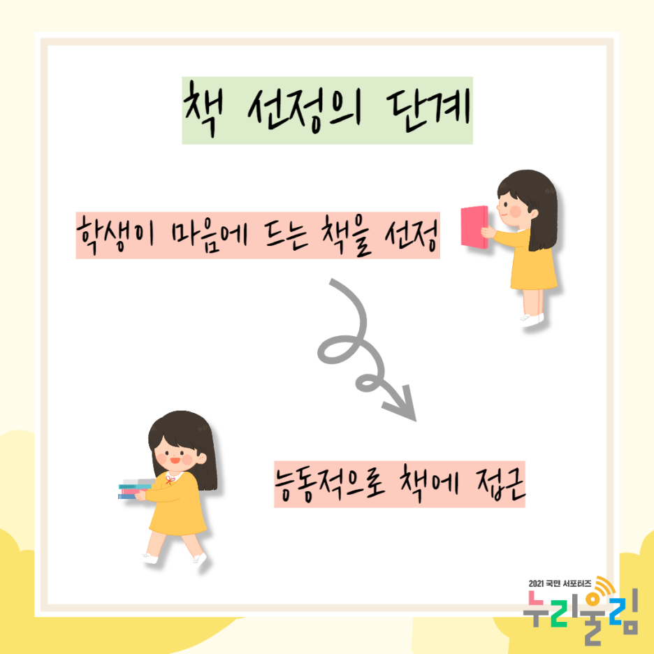 여기서 저는 ‘선생님께서 책을 소개해주시고, 흥미가 가는 책 한 권을 고르는 방법’으로 책을 선정하였습니다. 수동적으로 제시된 책을 무조건 읽는 것이 아니라, 내 기호에 맞게 책을 선정하기 때문에 능동적으로 실천할 수 있다는 것에서 기쁨을 느꼈습니다.