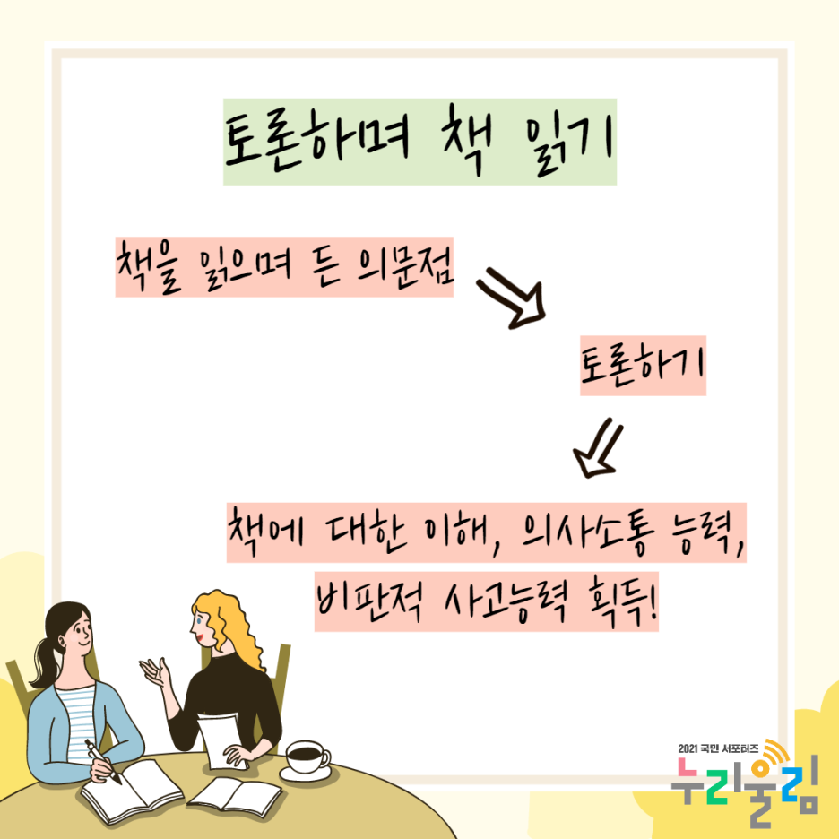 우선 첫 번째로 제시하는 방안은 ‘토론’의 방안입니다. 책을 읽는 것 자체로도 의미 있는 활동이지만, 책을 읽고 의문이 든 점을 골라서 친구들과 토론을 하는 수업은 의미를 증폭시킬 것입니다. 토론하며 학생들은 책에 대한 이해는 물론, 의사소통 능력을 자연스레 얻게 되고, 비판적인 사고능력을 가지게 됩니다.