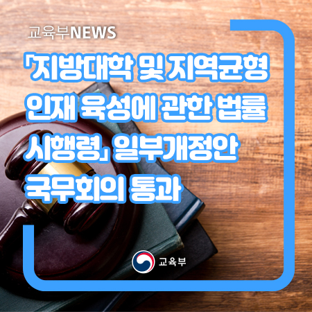 교육부(부총리 겸 교육부장관 유은혜)는 5월 25일(화) 열린 국무회의에서 「지방대학 및 지역균형인재 육성에 관한 법률(이하 ‘지방대육성법’) 시행령」 개정안을 심의‧의결하였다고 밝혔다.