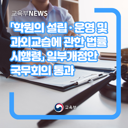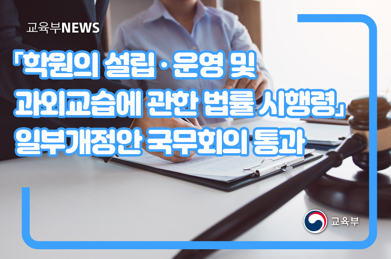 교육부(부총리 겸 교육부장관 유은혜)는 5월 25일(화)에 열린 국무회의에서「학원의 설립‧운영 및 과외교습에 관한 법률 시행령」일부개정안을 심의·의결하였다고 밝혔다.