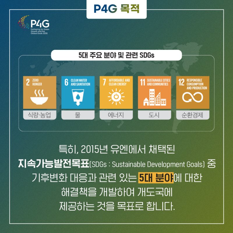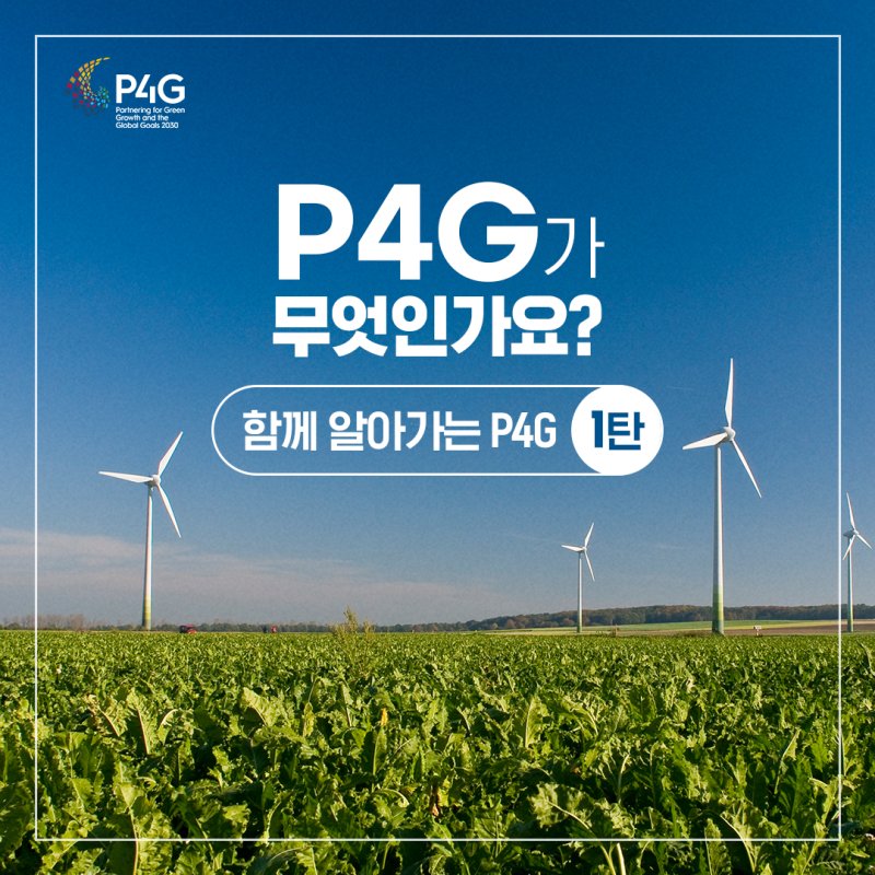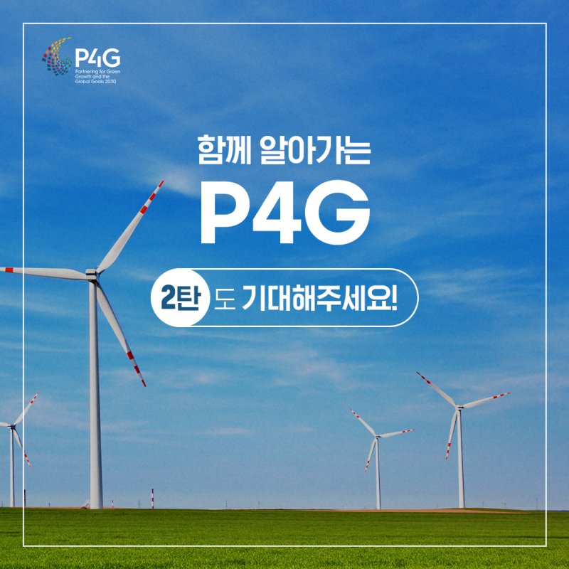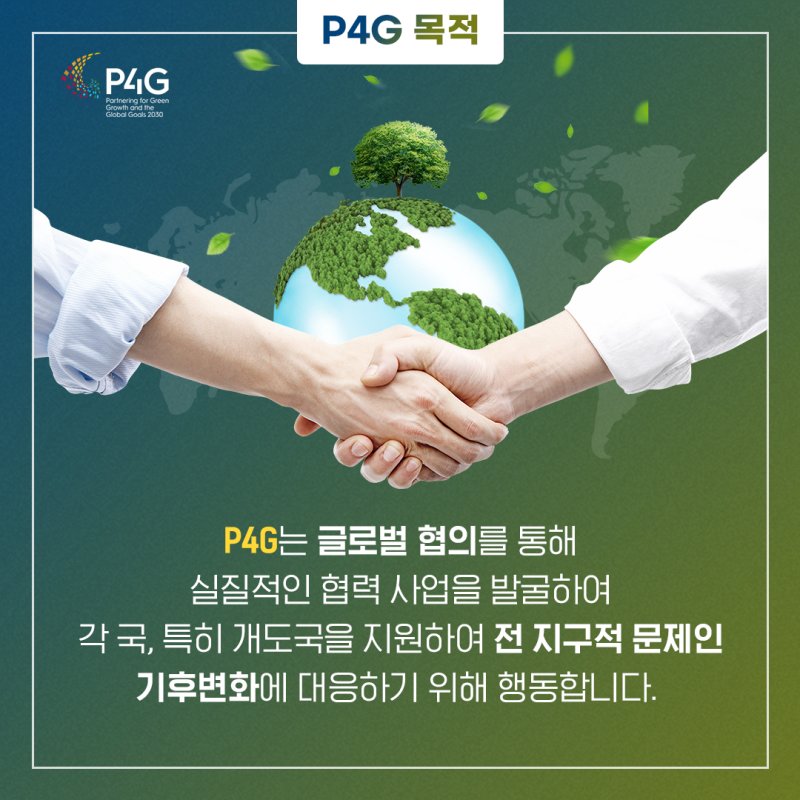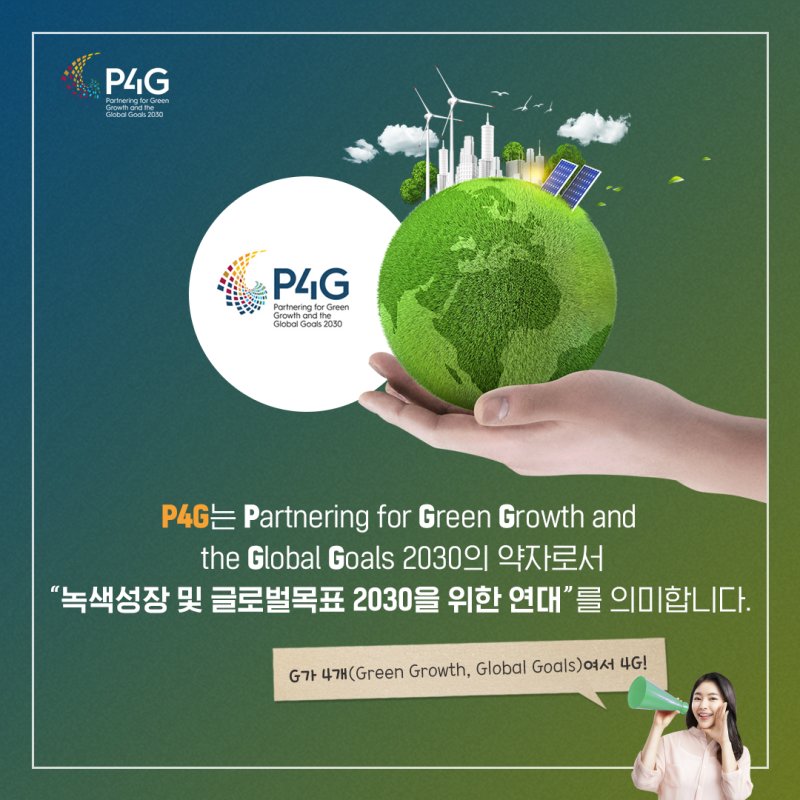 P4G는 Partering for Green Growth and the Global Goals 2030의 약자로서 "녹색성장 및 글로벌목표 2030을 위한 연대"를 의미합니다.