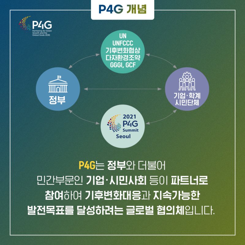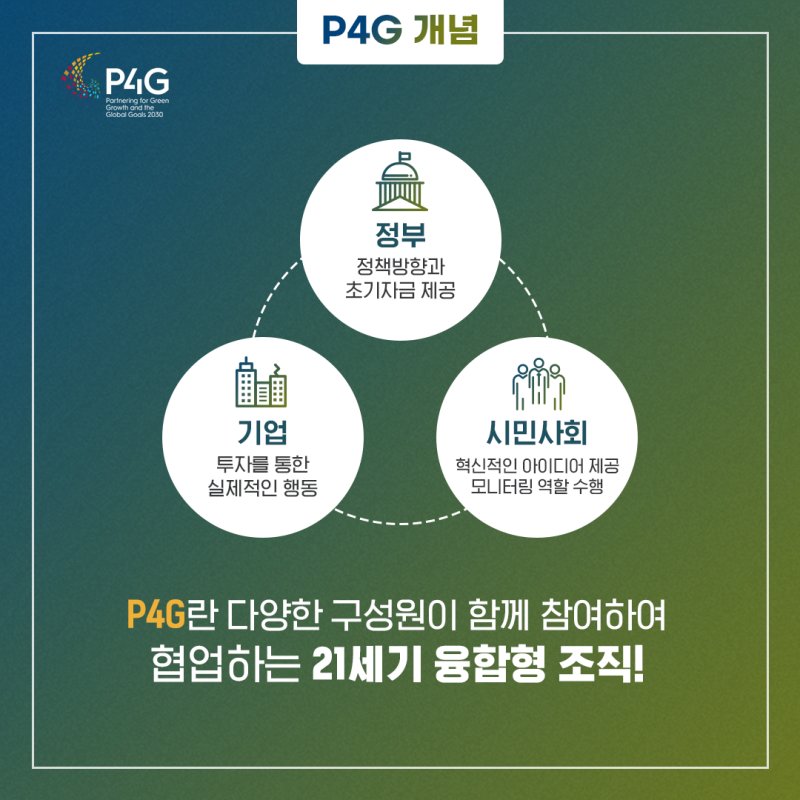 P4G는 정부와 더불어 민간기업인 기업·시민사회 등이 파트너로 참여하여 기후변화대응과 지속가능한 발전목표를 달성하려는 글로벌 협의체입니다.