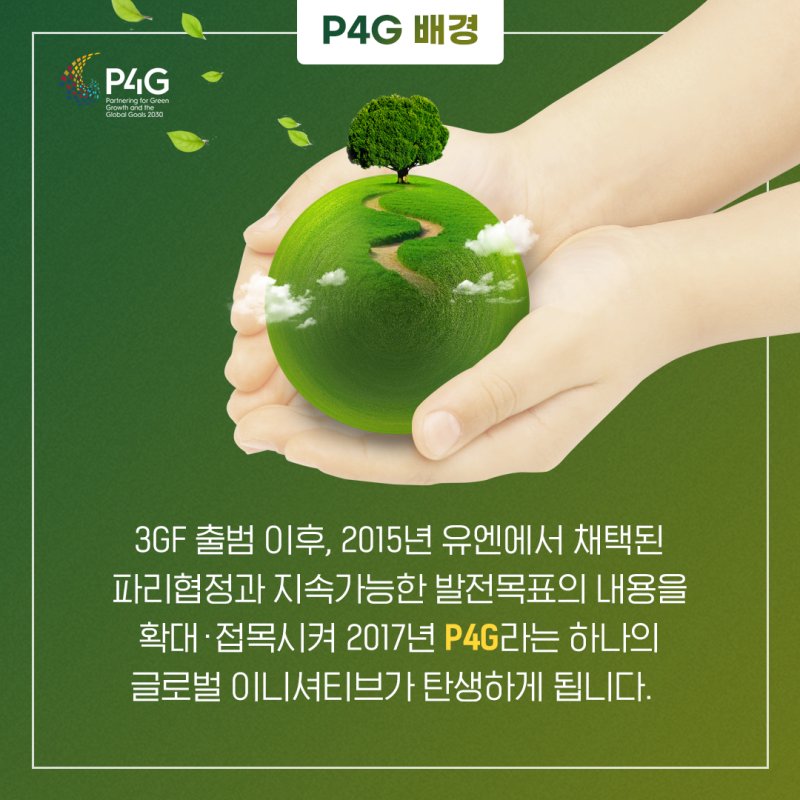 3GF 출범 이후, 2015년 유엔에서 채택된 파리협정과 지속가능한 발전목표의 내용을 확대·접목시켜 2017년 P4G라는 하나의 글로벌 이니셔티브가 탄생하게 됩니다.