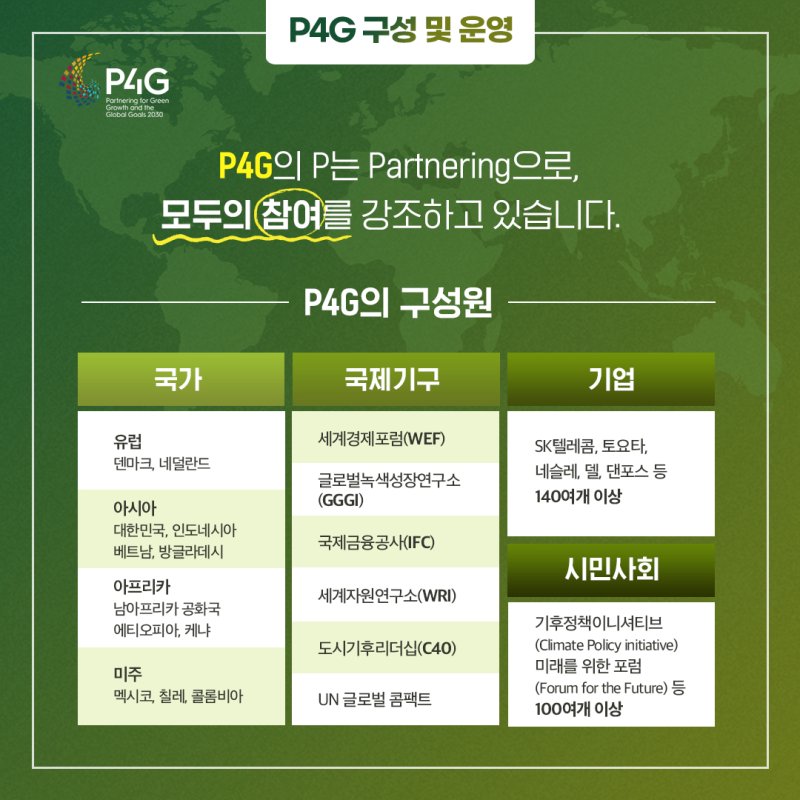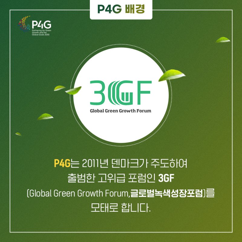 P4G는 2011년 덴마크가 주도하여 출범한 고위급 포럼인 3GF(Global Green Growth Forum, 글로벌녹색성장포럼)를 모태로 합니다.