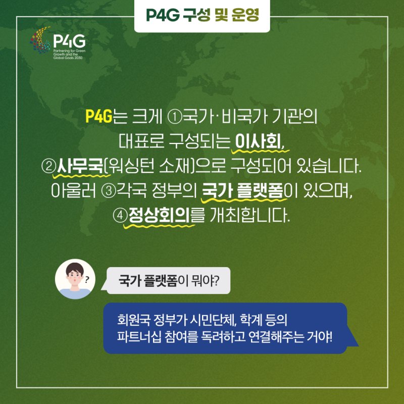 P4G는 크게 국가·비국가 기관의 대표로 구성되는 이사회, 사무국(워싱턴 소재)으로 구성되어 있습니다.
