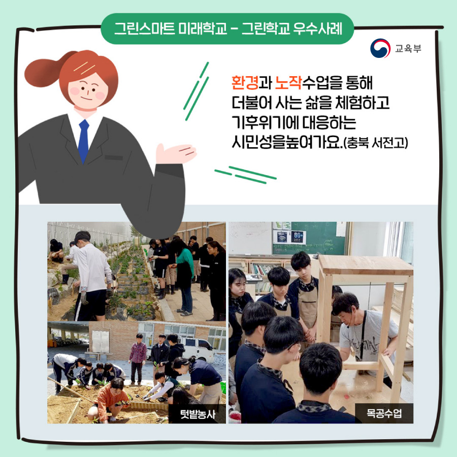 ✔ (충북 서전고) 환경과 노작수업을 통해 더불어 사는 삶을 체험하고 기후위기에 대응하는 시민성을 높여가요.