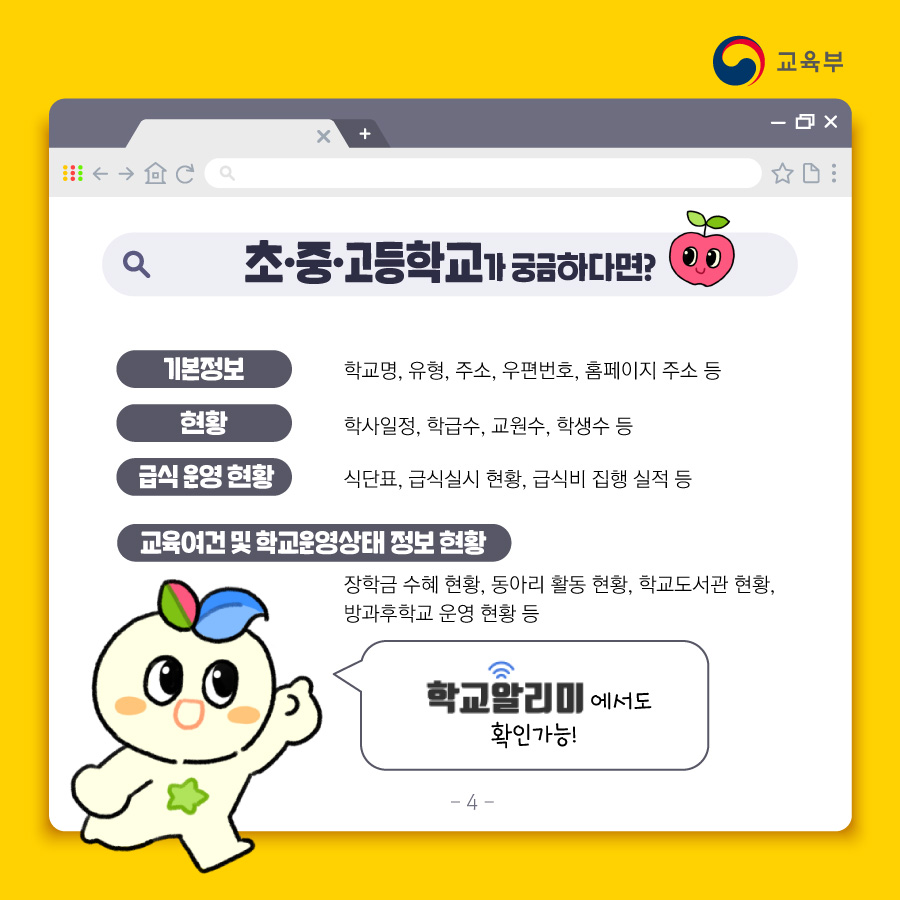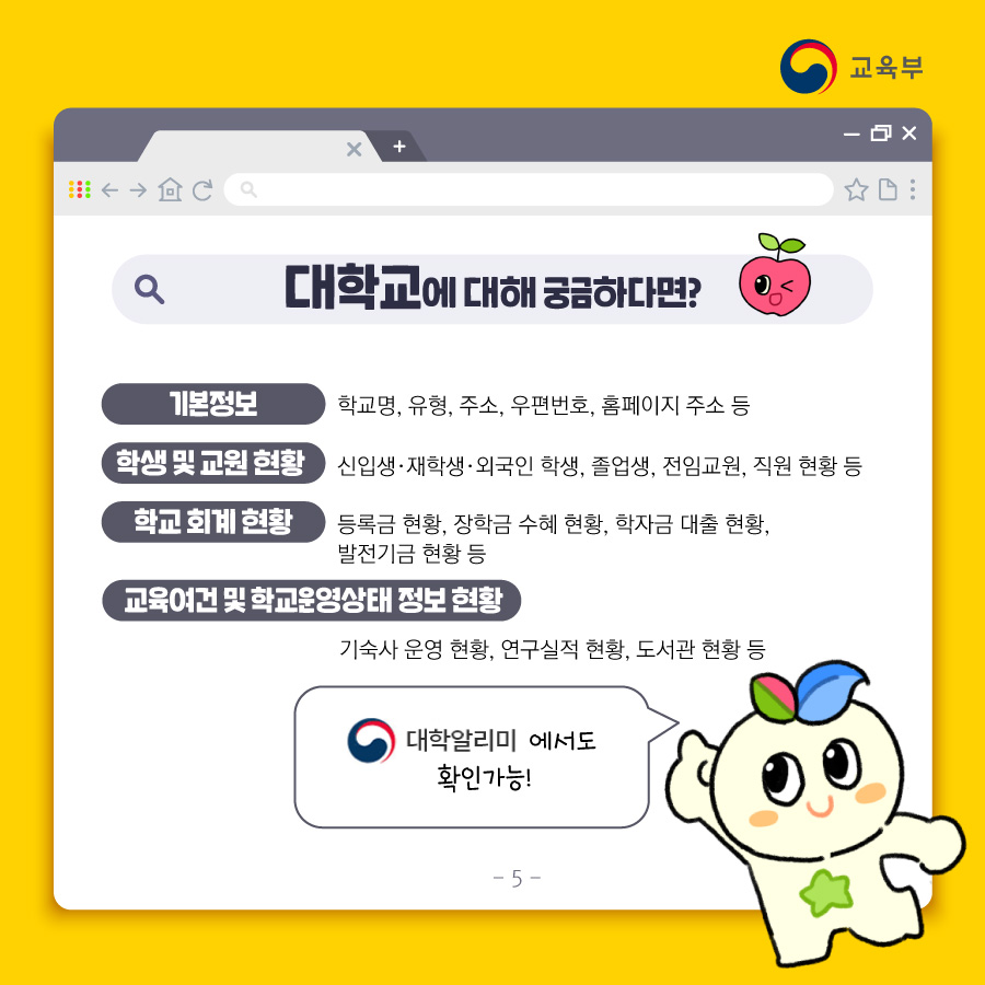 이 외에도 유치원알리미, 학교알리미, 대학알리미 등에서 많은 정보를 찾을 수 있답니다.