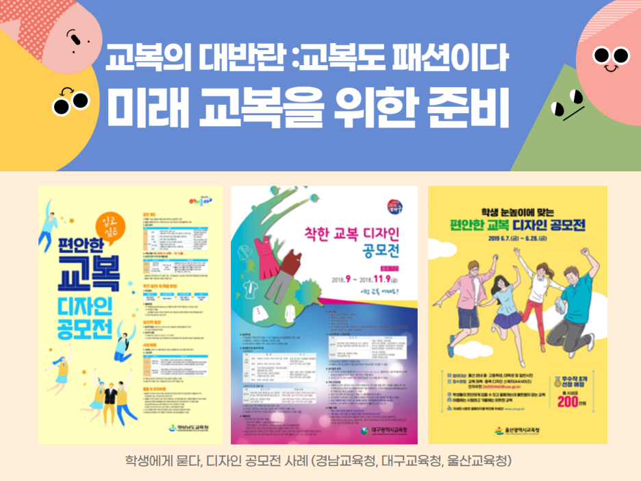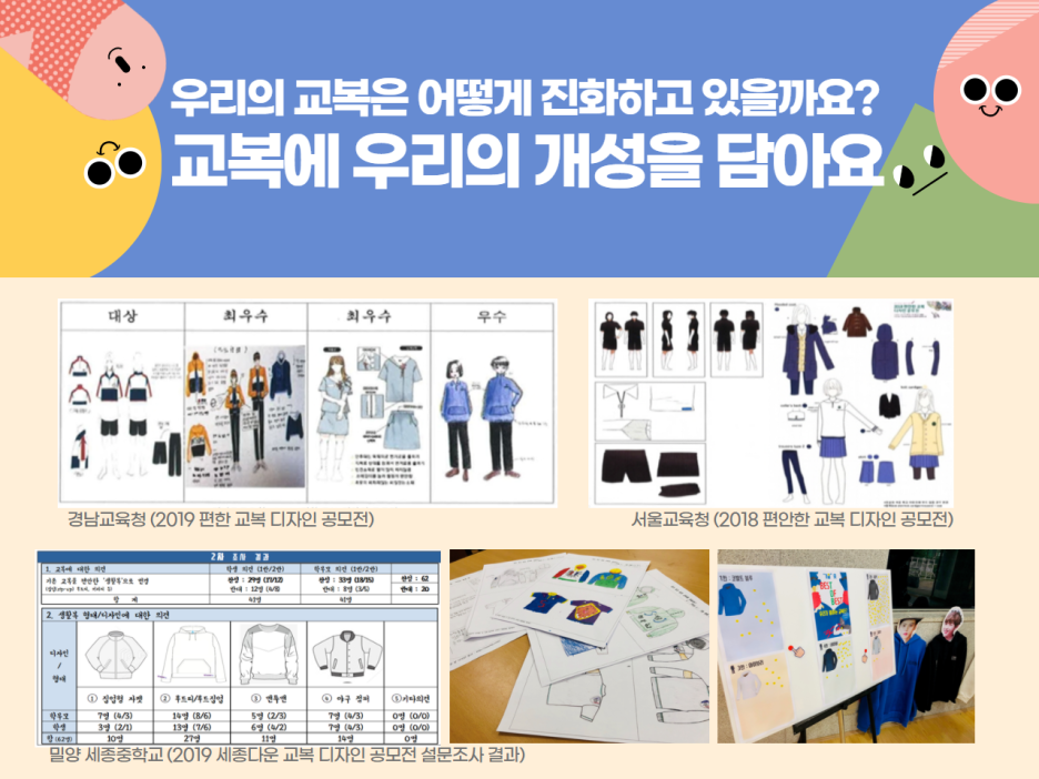 예뻐 보이고 싶고, 겨울엔 따뜻하고 여름엔 시원하며, 입고 벗을 때 편리하고, 학용품을 넣을 수 있는 주머니가 필요한 학생들의 다양한 요구를 모두 충족시킨 교복이 많이 생겨날 것이라 기대합니다.