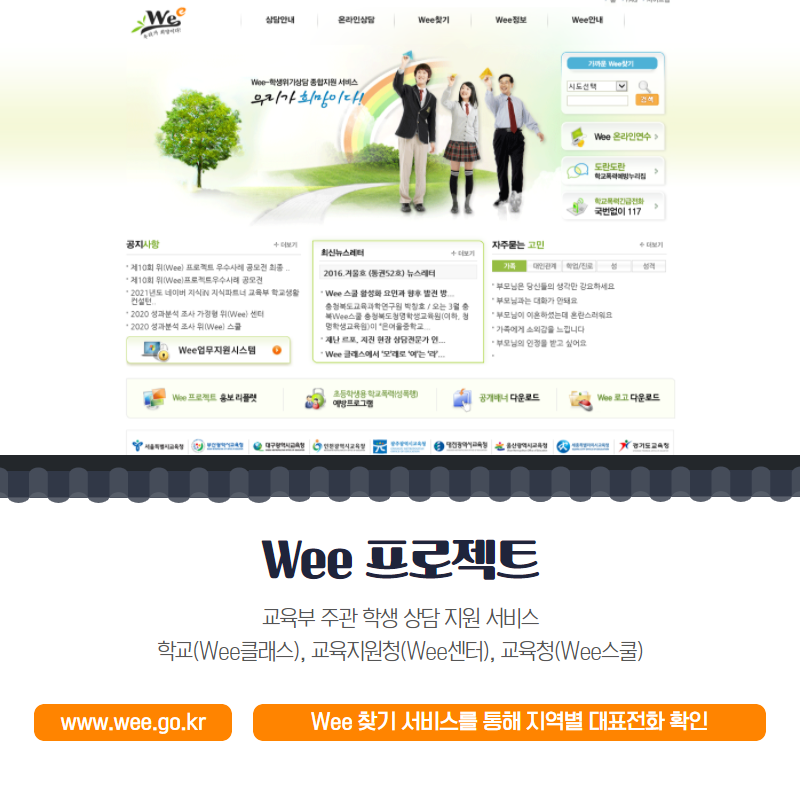 학교 및 교육(지원)청에서 학생 상담을 지원합니다. 학교 단위에는 Wee클래스, 교육지원청 단위에는 Wee센터, 교육청 단위에는 Wee스쿨이 있습니다. 학교에서 상담을 받고 싶다면, 교내 Wee클래스에 방문하면 됩니다. Wee클래스에서는 전문상담교사가 배치되어 있어 심리상담이 가능합니다. Wee센터에는 전문상담교사 외에도 전문상담사와 임상심리사와 사회복지사가 배치되어 있어 전문적인 상담과 치유지원 서비스를 받을 수 있습니다. Wee스쿨은 고위기 학생을 대상으로 기숙형 장기위탁교육을 운영하는 기관입니다.