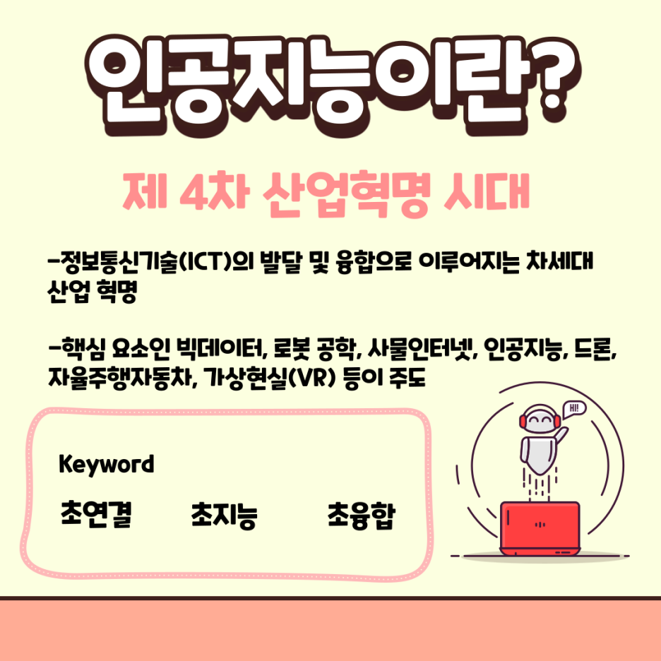 여러분, 인공지능은 많이 들어보셨죠? 그렇다면 혹시 인공지능 교육에 대해 들어보신 적 있나요? 2000년대를 들어서면서 급격히 관심이 증가한 4차 산업혁명으로 인해 인공지능에 관한 관심도 덩달아 높아지면서 인공지능을 활용한 교육의 중요성도 증가하고 있습니다. 따라서, 현재 많은 나라에서 인공지능 교육이 도입되고 있는데요. 물론 한국에서도 고교 진로 선택과목으로 선정되었으며 2025년부터는 초·중·고 교육과정에 포함되어 많은 학생들이 배우게 됩니다! 하지만, 그래도 아직까지는 인공지능 교육에 대해 조금은 생소하게 느껴지실 것 같은데요. 그래서 오늘은 인공지능에 대한 기본 설명부터 다른 나라의 교육 사례까지 인공지능 교육에 대해 전반적으로 함께 알아보는 시간을 갖도록 하겠습니다!