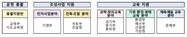 교육 지원 분야에서는 과학기술정보통신부‧중소기업벤처기업부‧특허청이 과학‧창의 교육 분야를 담당하고, 환경부‧해양수산부‧산림청‧기상청이 기후‧환경‧생태 교육 분야, 문화체육관광부는 체육‧예술 교육 분야의 협업과 지원 사항을 논의한다.