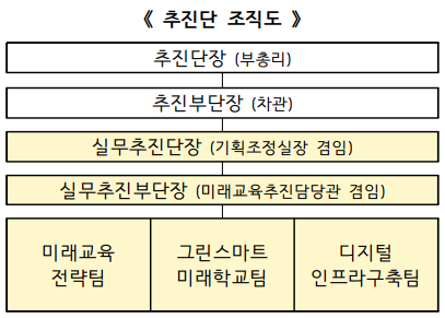 실무추진단은 교육부 직제 개정(’21.. 6. 8)을 통해 신설된 ‘미래교육추진담당관’을 부단장으로 하여, 3개의 자율팀(①미래교육전략팀, ②그린스마트미래학교팀, ③디지털인프라구축팀)으로 구성‧운영할 계획이다.