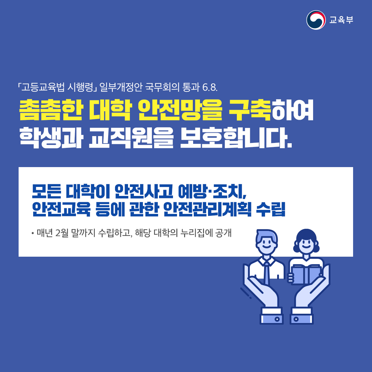 모든 대학은 매년 2월 말까지 안전사고 예방·조치, 안전교육 등에 관한 안전관리계획 수립