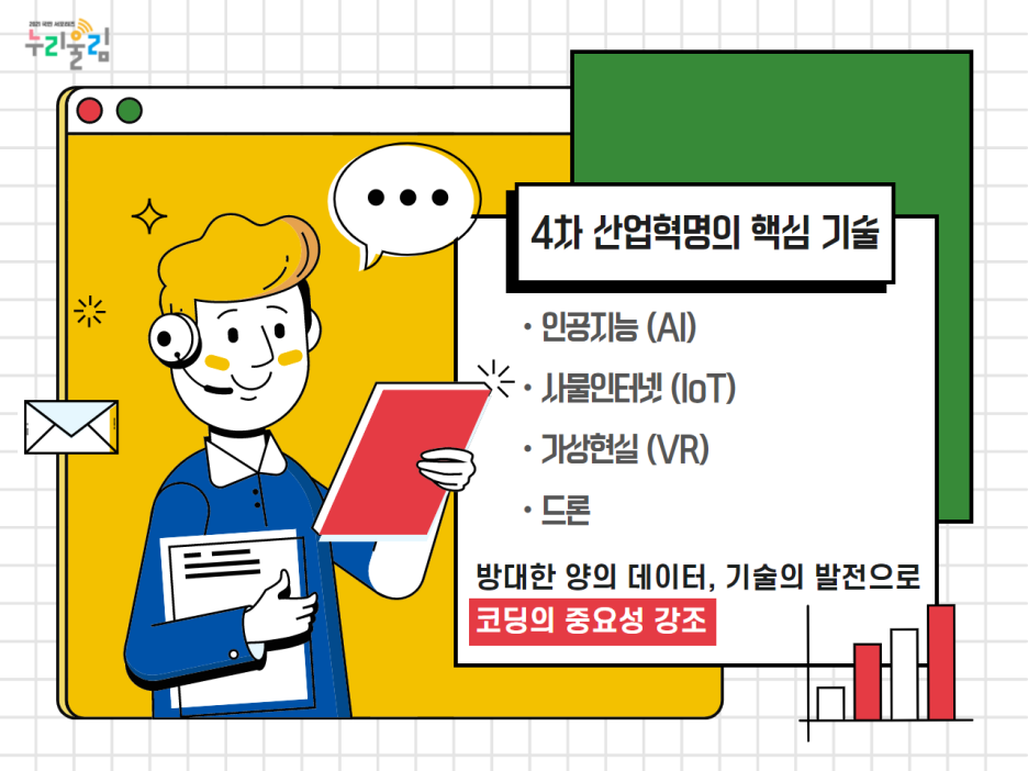 여러분은 4차 산업혁명에 대해 어떤 생각을 갖고 계시나요? 인공지능, 사물 인터넷, 빅데이터 등 첨단 정보통신기술이 경제와 사회 전반에 변화를 일으키는 산업혁명을 4차 산업혁명이라고 하는데요. 이제 4차 산업혁명은 어디를 가든 빠지지 않고 있고, 우리는 4차 산업혁명을 통해 발전된 기술을 바탕으로 살아가고 있습니다. 다양한 정보 기술이 기존 산업과 서비스에 융합되거나 여러 분야의 신기술과 결합되어 모든 제품 및 서비스를 하나의 네트워크로 연결한다는 것이 신기하지 않나요? 오늘 제가 소개할 주제는 바로 이 신기한 세계, 코딩과 그 중요성입니다!
