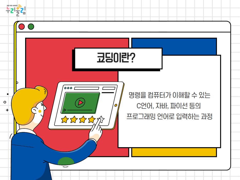 그렇다면 코딩이란 무엇일까요? 코딩이란, 컴퓨터에게 명령을 할 때 컴퓨터가 이해할 수 있는 C언어, 자바, 파이선 등의 프로그래밍 언어로 입력하는 과정을 말합니다. 좀 더 쉽게 이해하실 수 있도록 간단한 예를 하나 들어드릴게요.