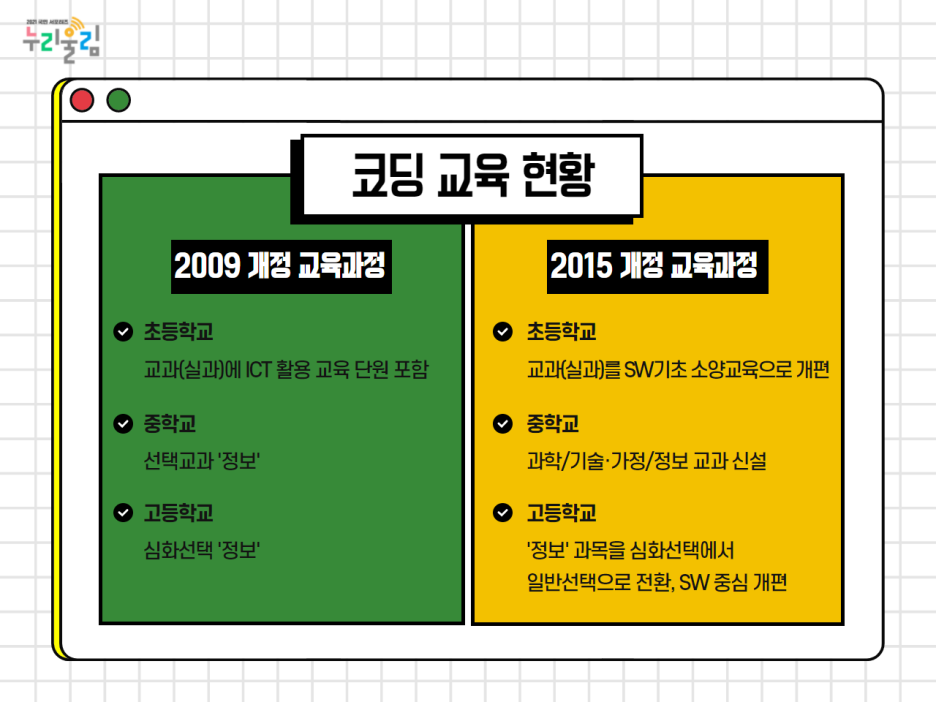 코딩의 중요성이 커진 만큼 교육과정에도 많은 변화가 생겼습니다. 2009 개정 교육과정에서는 초·중·고 교육에서 모두 소프트웨어(SW) 교육이 필수가 아니었습니다. 선택 교과였거나 교과 단원에서 간단하게 배우고 넘어갈 정도였지요. 그러나 2015 개정 교육과정에서는 소프트웨어(SW) 교육이 필수로 전환되었습니다.