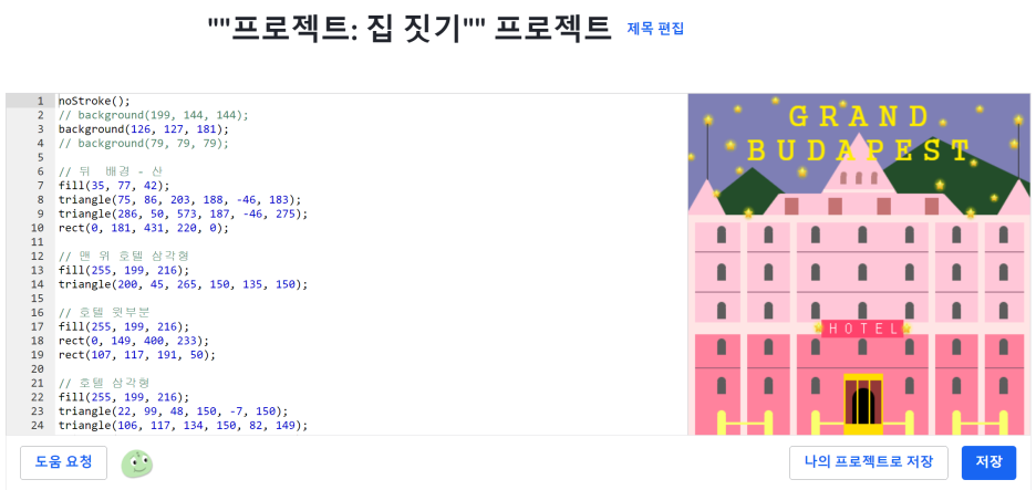 첫 번째 사례는 실제로 학교에서 배운 내용을 바탕으로 혼자서 직접 제작한 집입니다. 제가 참고한 그림은 ‘그랜드 부다페스트’라는 호텔인데 색감이 너무 예뻐서 학교에서 배운 방법들을 최대한 활용하여 집 만들기 프로젝트 과제로 제출했습니다. 결과물도 마음에 들었고, 이때의 경험 덕분에 코딩이 어렵다는 생각을 버릴 수 있게 되었답니다!