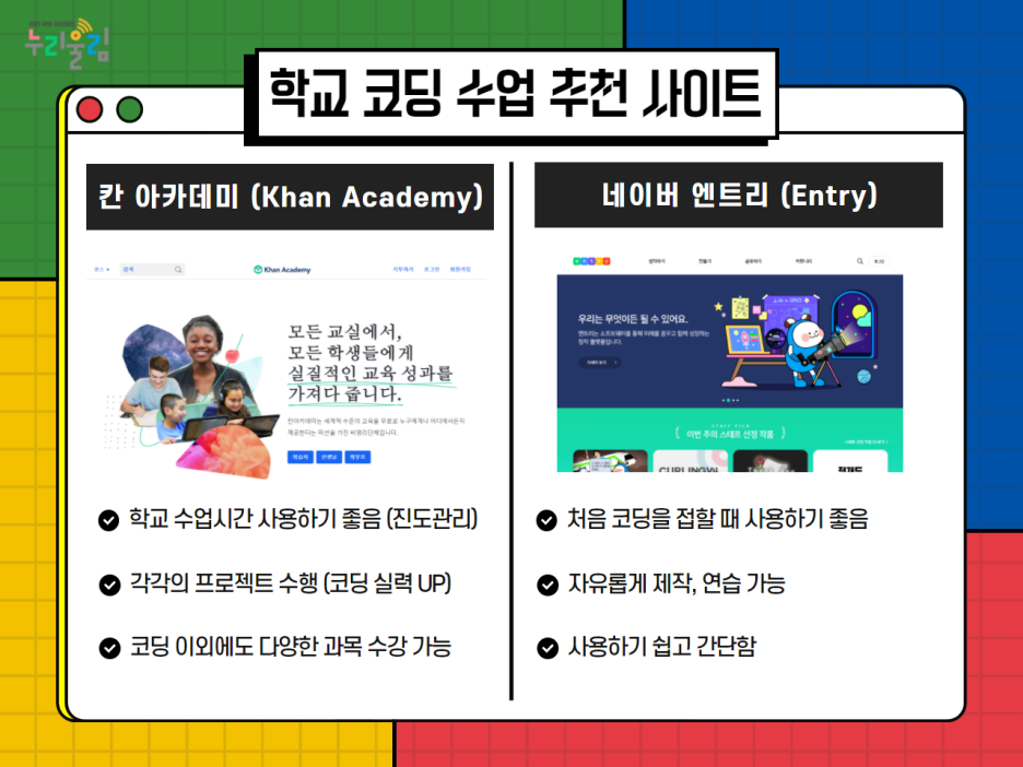 두 번째로 소개해드릴 사이트는 엔트리입니다. 엔트리는 소프트웨어를 통해 미래를 꿈꾸고 함께 성장하는 창작 플랫폼입니다. 기존의 텍스트 코딩이 아닌 블록형 언어를 기반으로 제작된 그래픽 기반 프로그래밍 프로그램으로, 크게 학습하기, 만들기, 공유하기, 커뮤니티로 구성되어 있습니다. 네이버의 비영리 교육 기관인 네이버 커넥트재단에서 운영하고 있으며 SW교육 의무화와 함께 전국의 초등학교 및 중학교 교과서에 채택되었다고 합니다. 중학교에서는 스크래치라는 교육용 프로그램을 사용했었는데 제가 직접 사용해본 결과 스크래치보다 엔트리가 훨씬 더 사용하는데 쉬운 것 같습니다. 이 프로그램은 학생들이 자유롭게 제작하고 연습할 수 있으며 사용법이 쉽고 간단해 처음 코딩을 접할 때 사용하기 좋다고 느꼈습니다.