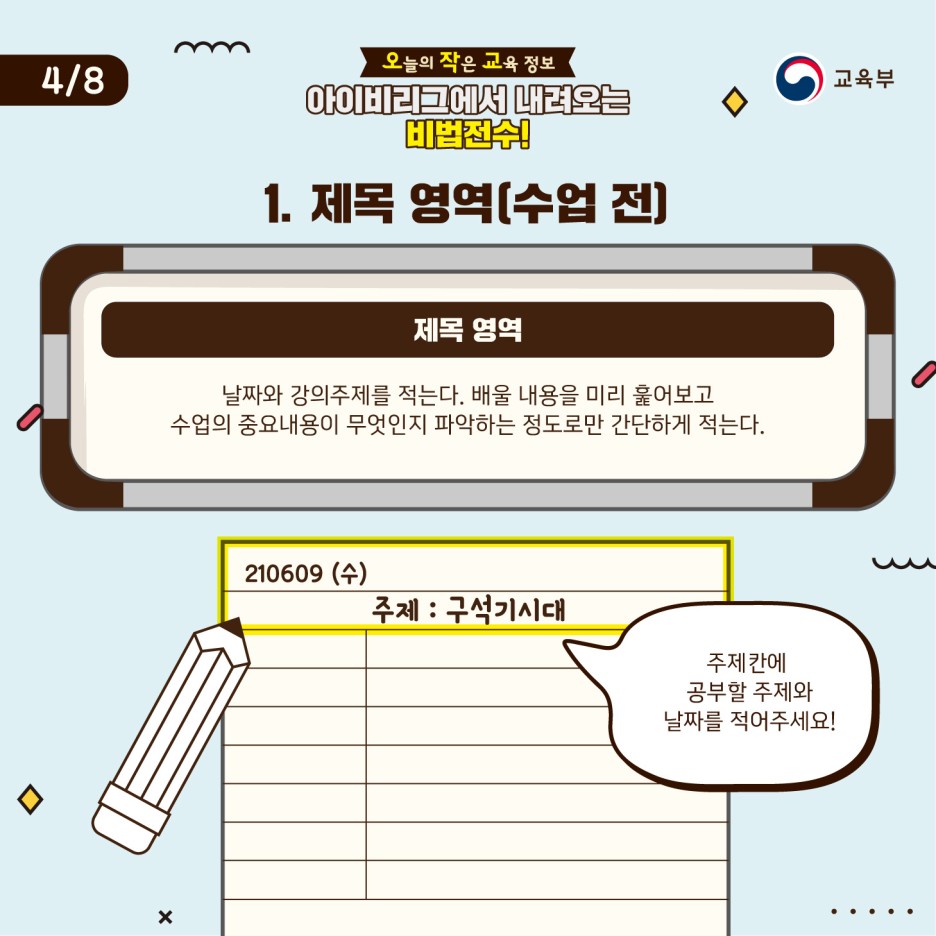 ✔ 제목 영역: 날짜와 강의 주제를 적는다. 배울 내용을 미리 훑어보고 수업의 중요 내용이 무엇인지 파악하는 정도로만 간단하게 적는다.
