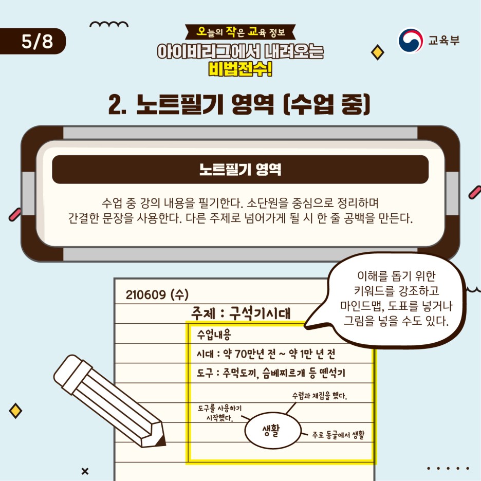 ✔ 노트를 영역별로 칸으로 나누어 필기하여 예습과 복습을 함께하고 시험 기간엔 노트만 봐도 배운 내용을 한번에 떠올릴 수 있는 효율적인 필기법 입니다.