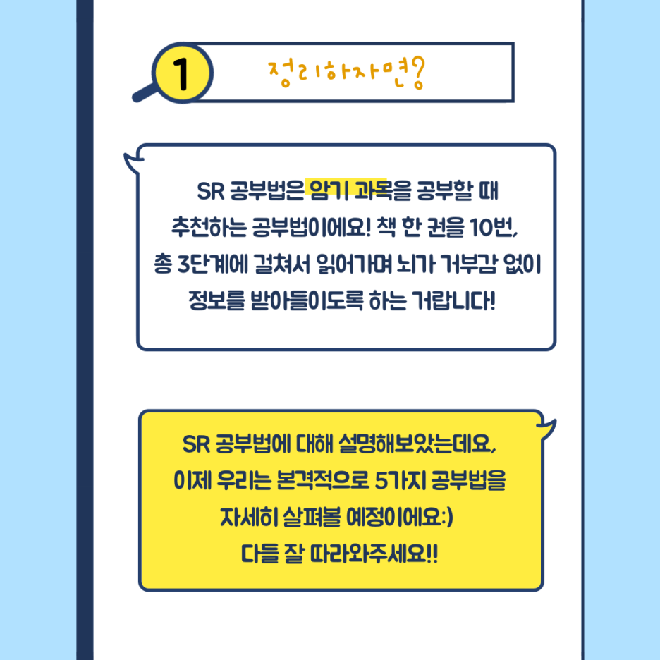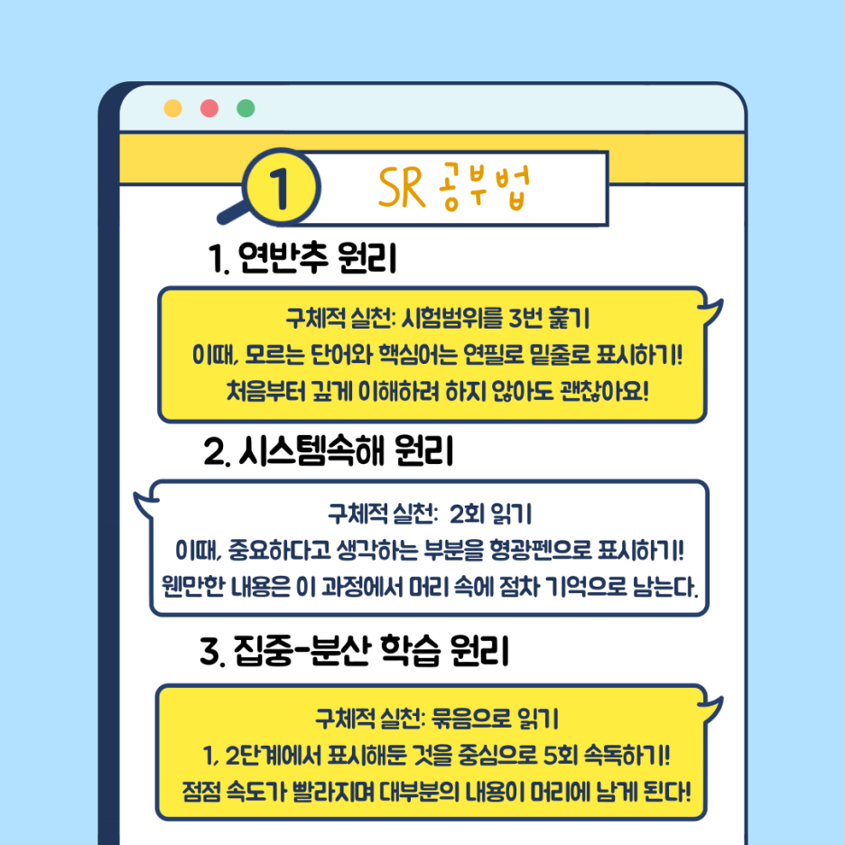 제일 먼저 소개할 공부법은 SR 공부법입니다. SR 공부법은 ‘Soft Review’의 약자로 연반추 공부법이라고도 하는데요. 책 한 권을 10번, 3단계에 걸쳐서 읽는 공부법 입니다.