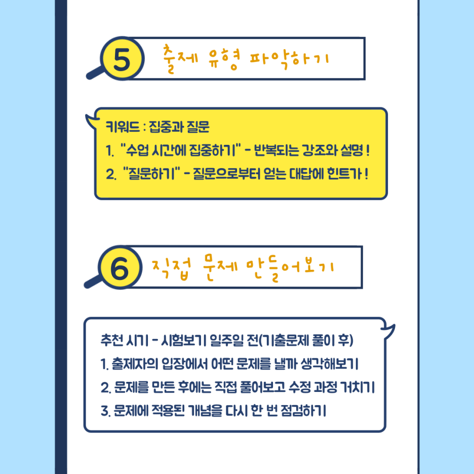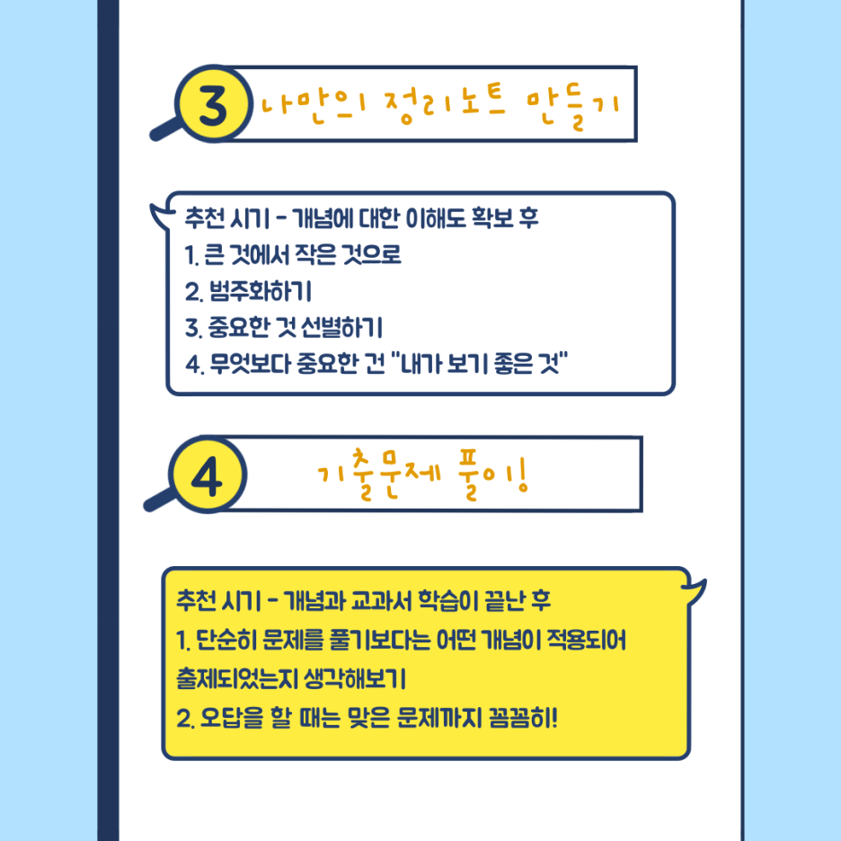 기출문제 풀이까지 끝나고 무엇을 해야 할지 모르는 분들에게 마지막으로 소개해드리는 공부법은 ‘출제 유형을 파악해 직접 문제를 내보는 것’입니다. 학교 시험은 선생님들께서 출제하는 것이므로 수업 시간에 잘 들어도 어느 정도 유추할 수 있습니다. 여기서, 수업 시간에 선생님이 강조하는 부분에 주목하는 것이 첫 번째 팁이고, ‘질문하기’가 두 번째 팁입니다! 수업 시간에 설명을 집중해서 듣다 보면 강조되고 반복되는 부분들이 보이기 시작합니다. 하나의 단어가 여러 번 언급되거나 저번 수업 때 설명되었던 부분이 재차 언급되면 그 부분에 주목할 필요가 있답니다! 반복과 강조는 결국 어떤 점을 집중적으로 봐야 할지 직결된다는 점! 기억하시면 좋을 것 같습니다.