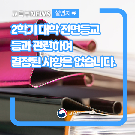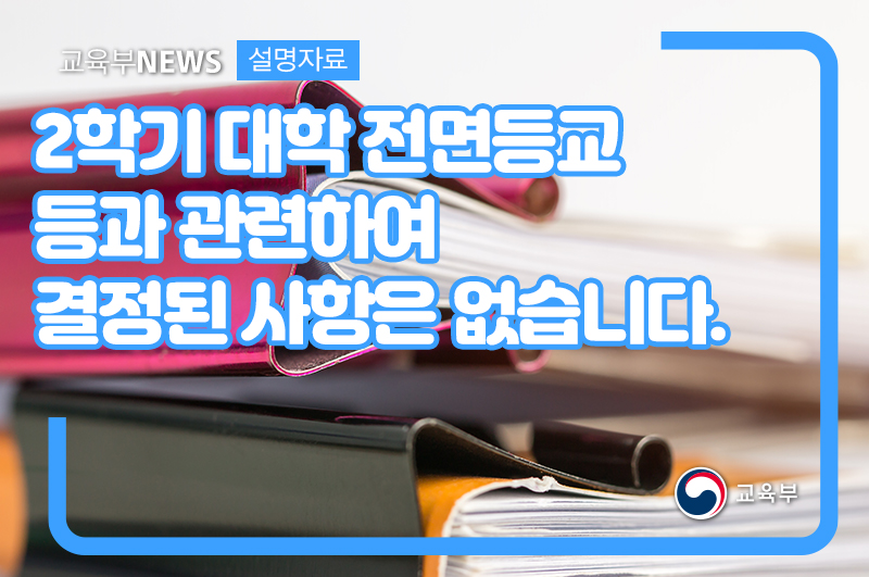 교육부는 학생을 비롯한 대학 구성원 및 관계기관들과의 충분한 소통과 협의를 바탕으로 2학기에도 안전한 교육 환경에서 원활한 학사 운영이 이루어지도록 다각적인 방안을 강구해 나가도록 하겠습니다.