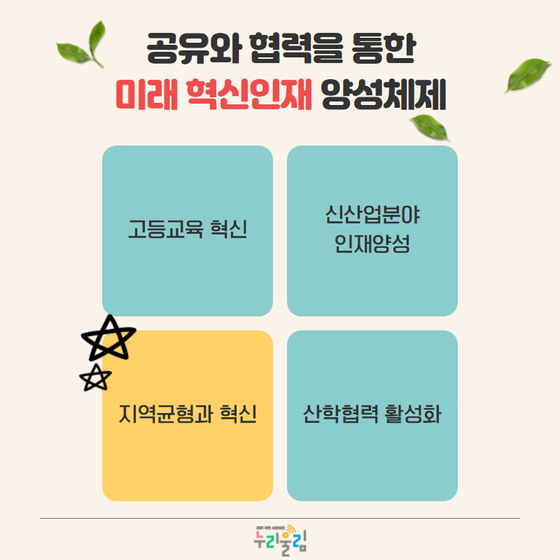 교육부는 시대 흐름에 맞게 ‘공유와 협력을 통한 미래 혁신인재 양성체제’를 구축한 바 있습니다. 여기에는 크게 고등교육 혁신, 신산업분야 인재 양성, 지역균형과 혁신, 산학협력 활성화의 4가지 분야가 있습니다. 고등교육 혁신분야에서는 신산업 분야에서 대학의 혁신을 목표로 하여 첨단 융합학과를 신설하거나 첨단 분야 공동학과를 운영, 숙련된 인재 양성을 위한 마이스터대 시범 운영 등을 진행 중입니다. 신산업분야 인재 양성에서는 4단계 두뇌한국 21 사업으로 매년 뛰어난 인재들을 길러내고 있고요. 지역균형과 혁신에서는 대학이 지자체와 함께 발전을 목표로 두고 사업을 진행 중입니다. 마지막으로 산학협력 활성화 부분에서는 산학연협력단지를 조성하여 한 단계 높은 산업과 학업의 융합을 추구하고 있답니다.