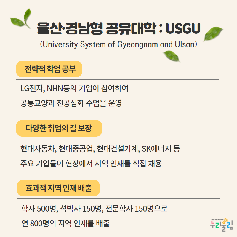 조금 더 구체적으로 살펴볼까요? 2020년 사업 대상으로 선정되었던 경남, 충북, 광주·전남 플랫폼의 좋은 결과 덕분에 2021년에는 신규 지역을 추가하게 되었답니다. 그중에서 대표적으로 2021년에 울산광역시가 추가로 선정되어 경상남도와 함께 플랫폼을 진행하게 되었는데요. 따라서, 현재는 울산·경남형 공유대학(USGU: University System of Gyeongnam and Ulsan)이라는 이름으로 진행하고 있답니다. 이 울산·경남형 공유대학(USGU)은 미래 인재를 위한 여러 가지 기반을 마련하고 있다고 합니다.