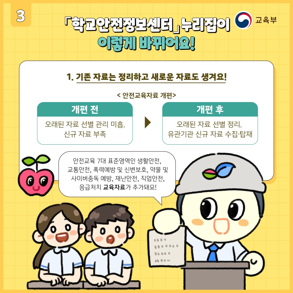 ✔ 안전교육 7대 표준영역인 생활안전, 교통안전, 폭력예방 및 신변보호, 약물 및 사이버중독 예방, 재난안전, 직업안전, 응급처치 교육자료가 추가돼요!