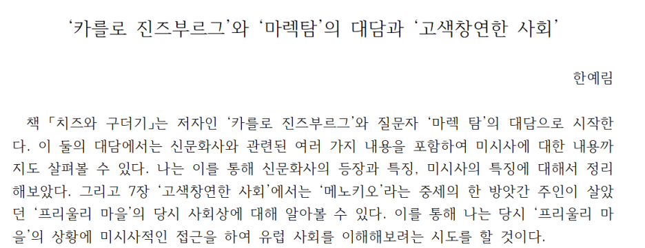 저는 책의 내용 중 한마을에 사는 인물에 대한 이야기를 통해 미시사적 접근으로 유럽 사회 전체를 이해하려는 시도를 했습니다. 해당 수업 시간에 ‘미시사’에 대해서 배웠던 만큼 그것을 활용하여 책을 읽어보고 해석했다는 것을 강조하기 위함이었습니다. 그리고 그다음에는 미시사적 접근의 효과와 한계점을 정리하고, 미시사적 역사서술을 해보면서 개인적으로도 모호했던 ‘미시사’에 대한 개념도 차근차근 정리할 수 있었답니다.
