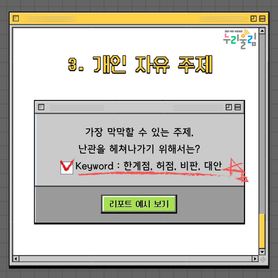 마지막으로는 개인 자유 주제로 리포트를 써야 할 경우입니다! 이런 경우에는 어떤 주제로 써야 할지 감이 잡히지 않아 막막할 때가 많은 것 같습니다. 하지만 이럴 때도 돌파구는 있지요.