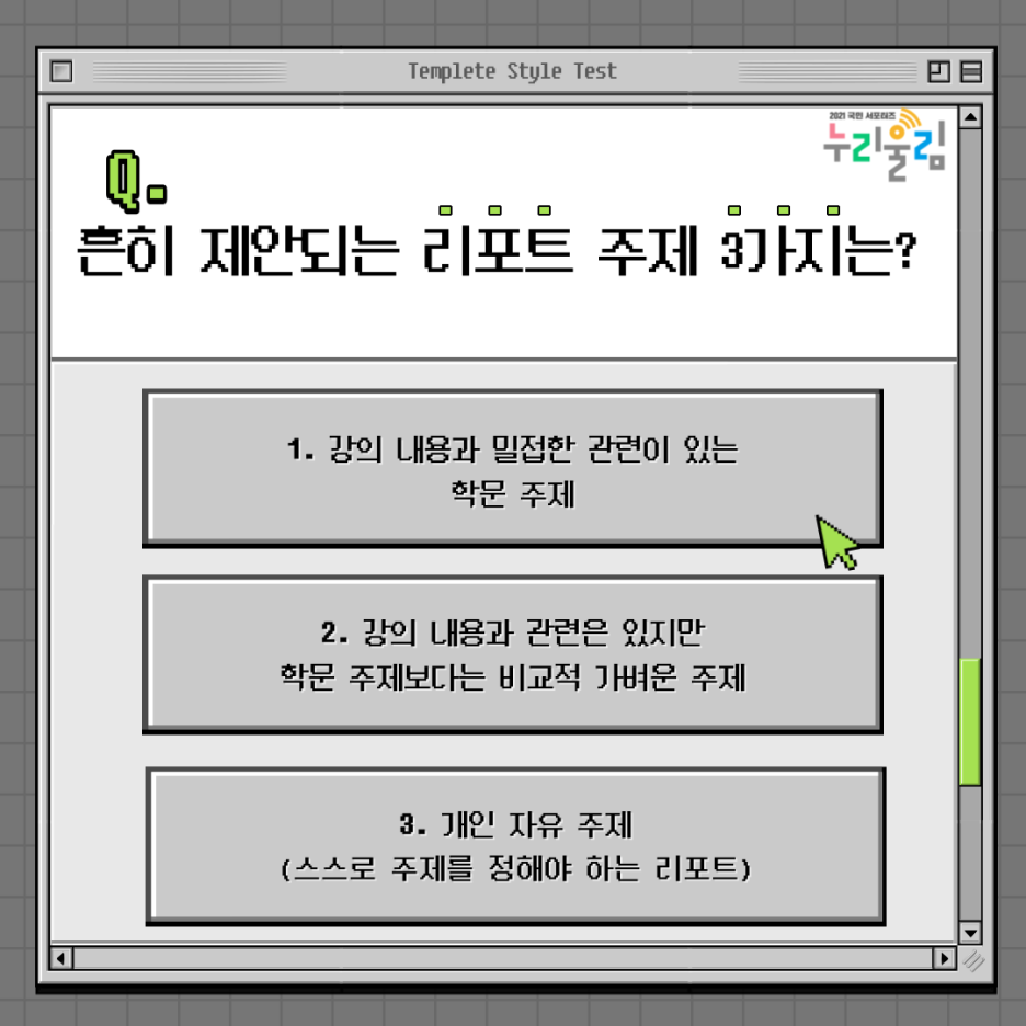 첫 번째로 강의 내용과 밀접한 관련이 있는 학문 주제, 두 번째로 강의 내용과 관련은 있지만 학문 주제보다는 비교적 가벼운 주제, 마지막으로 스스로 주제를 정해야 하는 개인 자유 주제가 있습니다. 이 3가지의 리포트 주제는 주제를 풀어나가는 방향이 비슷해 보일 수 있지만 각각의 차이는 다 있답니다! 하나씩 알려드릴게요!