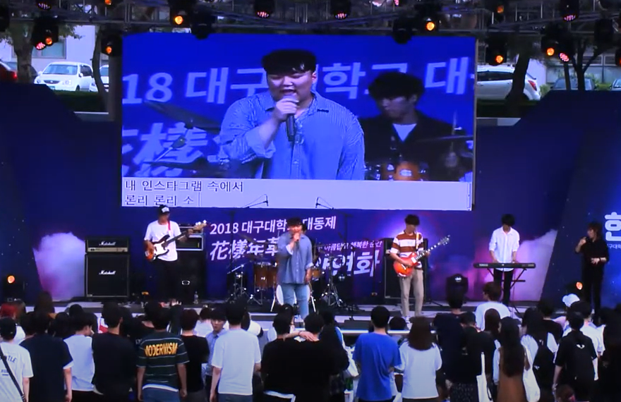 대구대학교에서도 2018년 대동제에서 장애 학생들이 축제를 즐길 수 있도록 그 벽을 허물었는데요. 축제 무대 스크린에 청각 장애 학생들이 노래 가사를 읽을 수 있도록 자막을 띄었습니다. 또한, 수화 통역 도우미를 위한 자리도 무대 한쪽에 마련했는데요. 현장에서 청각장애 학생들이 소외되지 않도록 세심하게 노력했다는 점을 알 수 있었습니다. 이렇게 점점 더 ‘모두’를 위한 축제라는 의미에 대학들이 한 발짝 더 가까워지고 있는 모습을 볼 수 있네요!