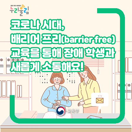 코로나19라는 위기 상황에서 장애 학생들은 학습적 어려움뿐 아니라 고립과 단절이라는 사회적 장벽을 마주해야 했는데요. 이제 벽을 허무는 배리어 프리(barrier free) 교육으로 모두가 함께 마주 보며 서로 이해하고, 대화해보면 어떨까요? 앞으로도 계속될 배리어 프리 교육에도 많은 관심 부탁드립니다!