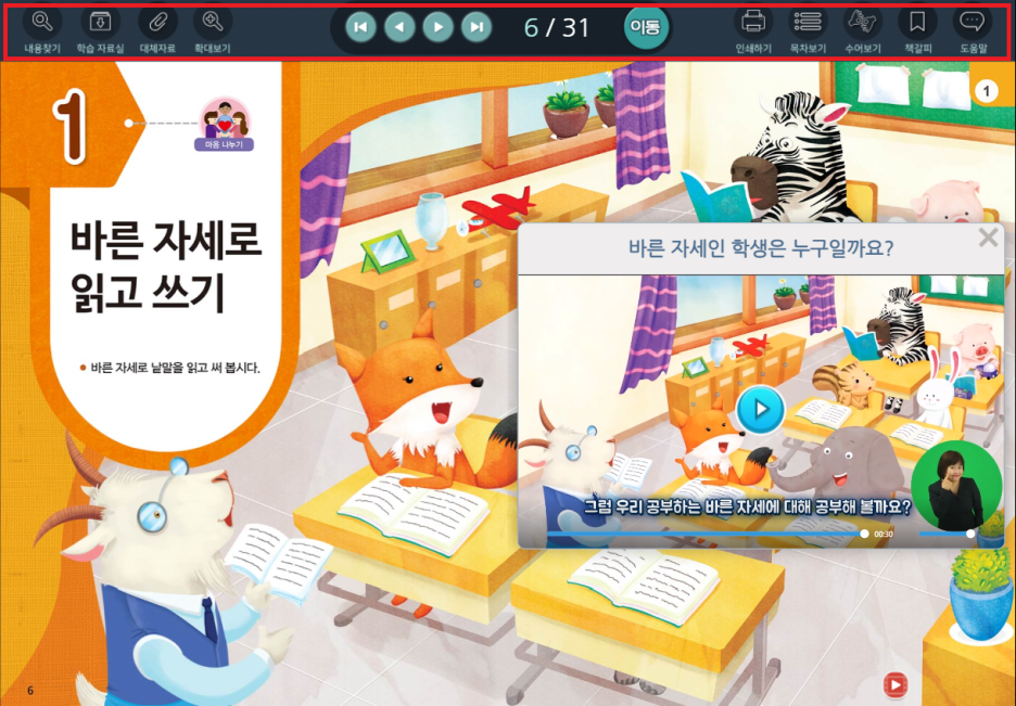 학습방에 입장하면 디지털 교과서를 찾을 수 있는데요. 교재는 기본 교육과정에 맞춰 초등, 중등, 고등으로 구분하며 글쓰기, 줄 긋기, 그리기 등 다양한 활동과 시청각 자료를 포함하고 있습니다. 교과서 상단 메뉴를 클릭하면 학생들의 필요에 따라 다양한 기능을 추가로 활용할 수 있는데요. 시각장애 학생들의 경우 ‘대체 자료’를 눌러 필요한 일반 전자 점자 자료와 음성 도서 자료를 받을 수 있습니다. 청각장애 학생들은 ‘수어보기’ 메뉴를 활용할 수 있는데요. 영상 시청 시 놓칠 수 있는 부분을 수어로 보면서 이해에 도움을 받을 수 있습니다. 현재 배우고 있는 교과 단원에 맞춰 활용자료도 이용할 수 있다고 합니다. 온라인 학습방은 EBS, 한국교육개발원, 시도교육청과 협력을 맺어 필요한 학습 자료를 공유하고 있는데요. 교사의 경우 추가로 필요한 자료를 요청해 수업에 활용할 수도 있습니다.
