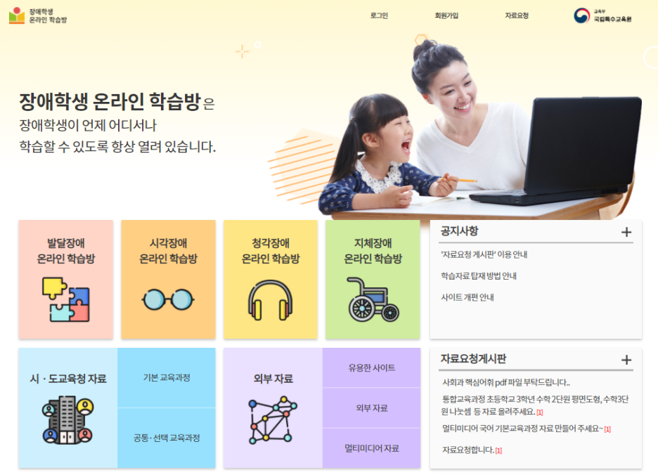 교육부 국립특수교육원에서는 원격수업을 할 때에도 장애 학생들이 다양한 콘텐츠를 활용하여 학습할 수 있도록 온라인 학습방을 운영하고 있습니다. 발달장애, 시각장애, 청각장애, 지체 장애 등 장애 영역에 맞춰 자료를 이용할 수 있는데요. 장애 학생이 언제 어디서나 학습할 수 있도록 로그인 없이 무료로 접속할 수 있습니다.