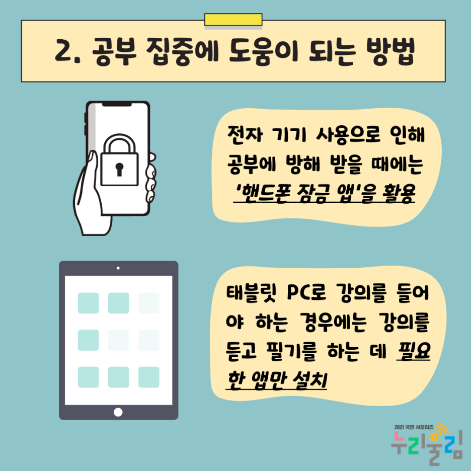 태블릿 PC를 통해 강의를 들어야 하는 경우에는 강의를 듣고 필기를 하는 데 필요한 앱만 설치를 해두고, 핸드폰을 아예 책상에서 멀리 떨어뜨려 놓는 방법도 있습니다. 이것 또한 제가 대학에 와서 활용하는 방법인데요, 핸드폰을 아예 방 밖에다가 두고 쉴 때에만 나가서 확인하면 집중하기가 보다 쉽습니다. 본인이 자제력이 있는 편이라고 생각하신다면 강의와 필기에 필요한 앱만 깔아두는 방법도 좋은 것 같아요. 필요한 앱만 깔아놓음으로써 다른 앱을 활용해서 딴짓을 하지 않을 수 있기 때문이죠. 그리고 핸드폰을 방 밖에다가 놓아두는 방법을 활용하면, 핸드폰이 눈앞에서 보이지 않기 때문에 핸드폰으로부터 오는 유혹을 뿌리치기가 좀 쉬워집니다. 특히 거실이나 부엌 쪽에 가져다 놓으면 아무래도 찔끔찔끔 나가지는 않겠죠?